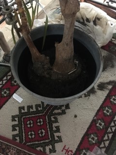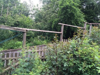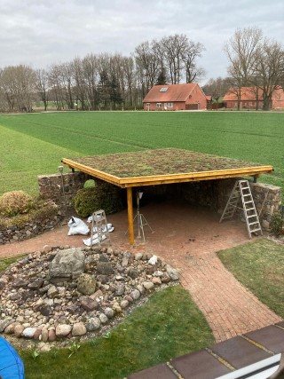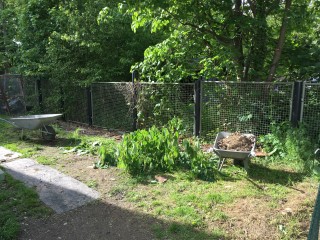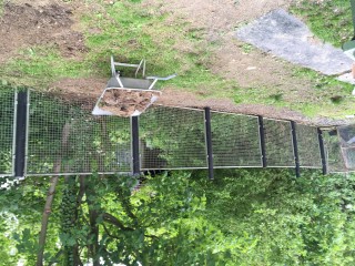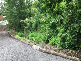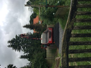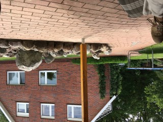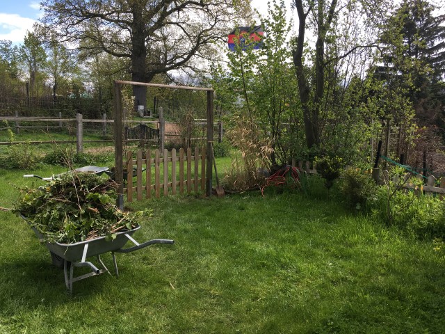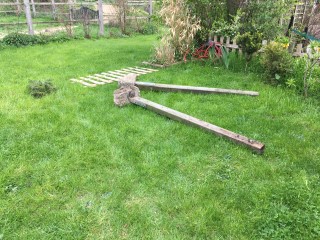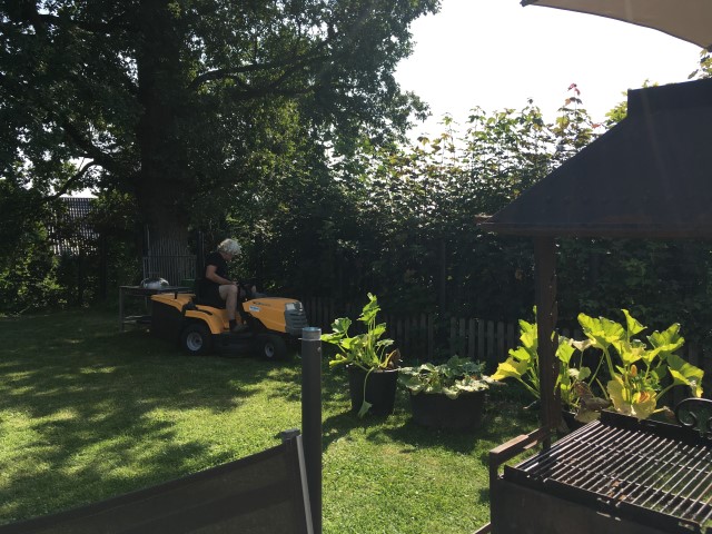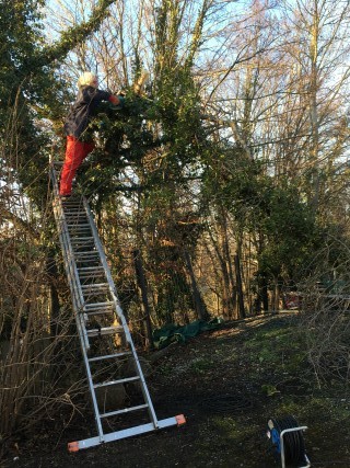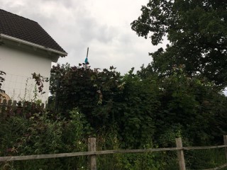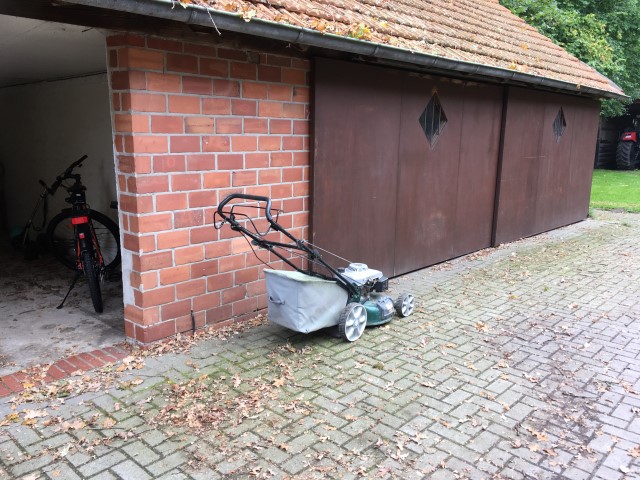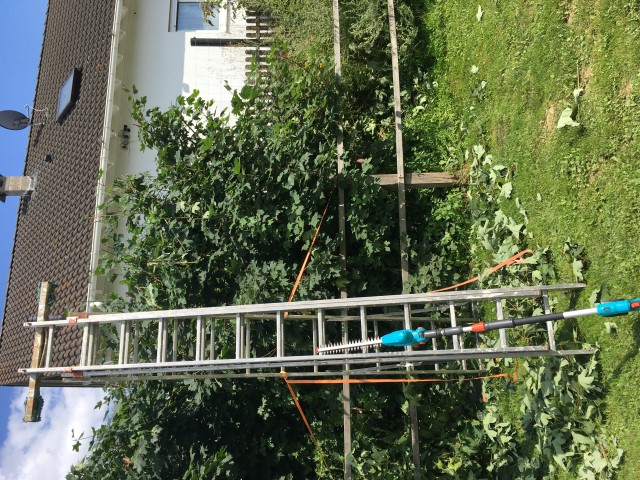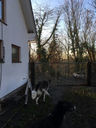 Der große Ast und die Tauben! Das ist mein Parkplatz, und die Tauben sitzen auf dem Ast darüber und ihre Hinterlassenschaften landen auf das arme Auto! Jetzt ist Schluß damit! Achim schnappt sich die Säge und ab ist der Ast!