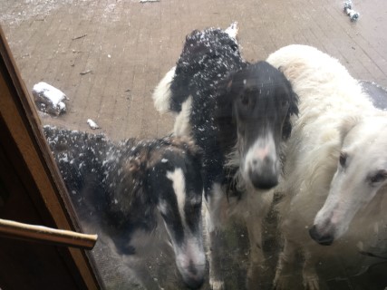 Der Tag danach! Es schneit immer noch ganz fein. Die Barsois finden das toll, rennen und spielen, und tragen den Schnee ins Haus. Dann sind sie müde und pennen `ne Runde, und weiter geht`s!