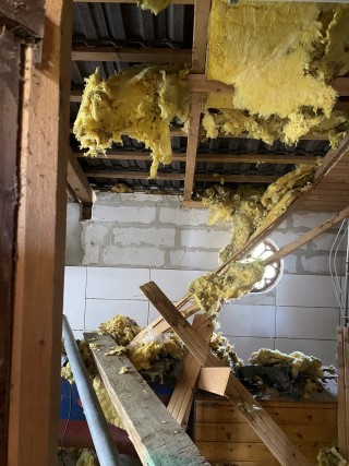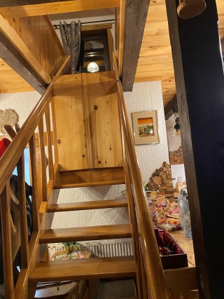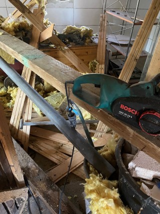 06.04.2023: Und weiter geht es mit dem Ausbau des Welpenzimmers. Da die Wand, die raus mußte, eine "tragende" war, wie sich rausstellte, mußte ein neuer Balken eingezogen werden! Der riß die Deckenvertäfelung runter! Na, danke, es hätte ja auch einfach gehen können.
