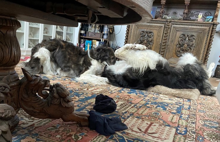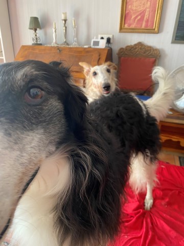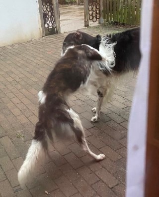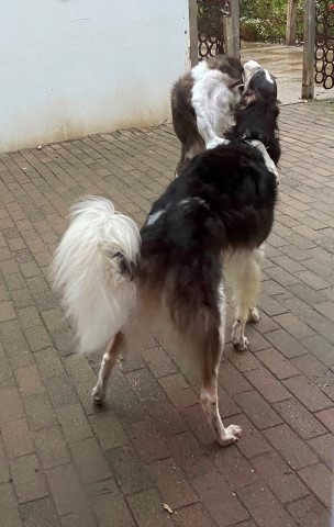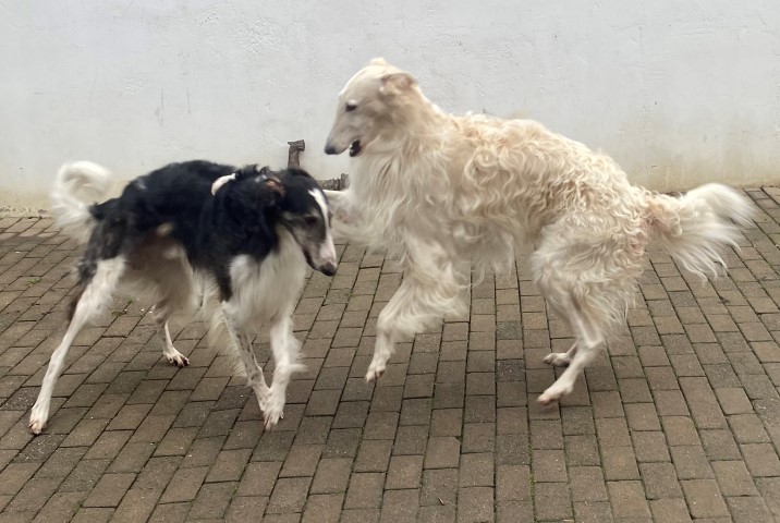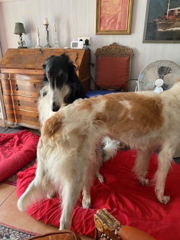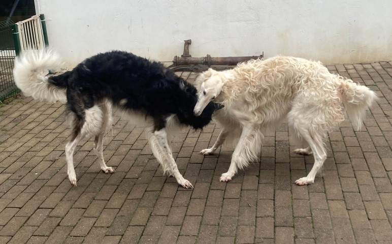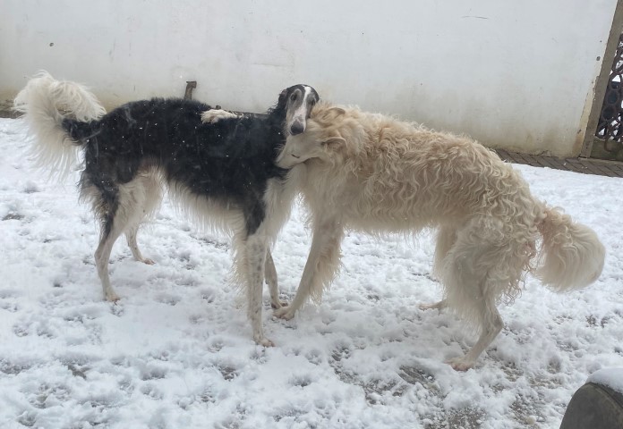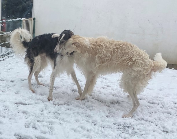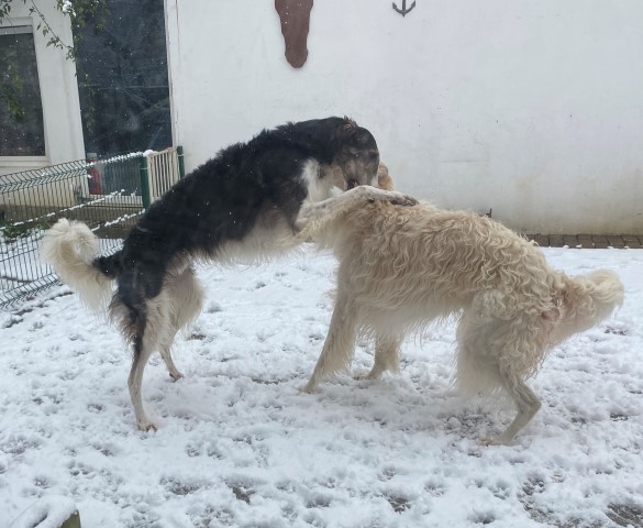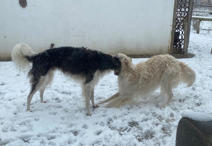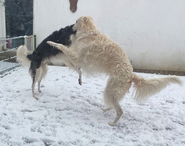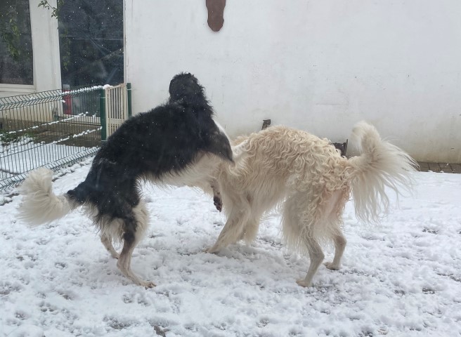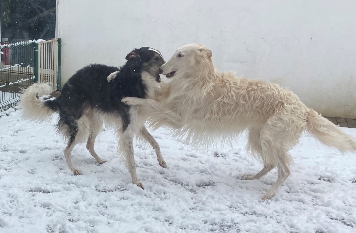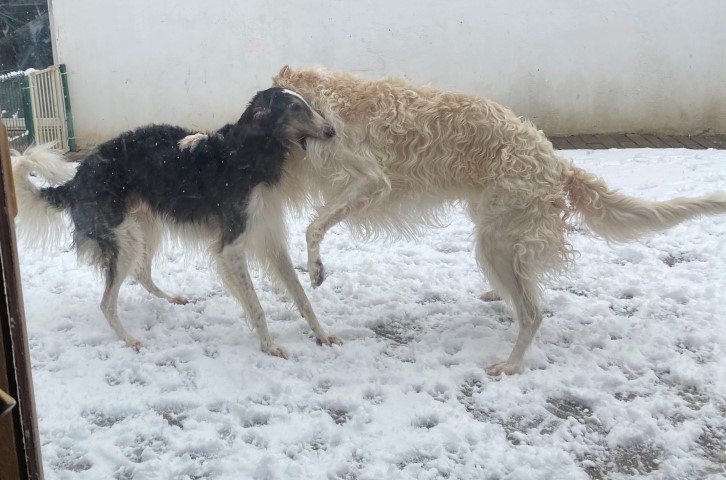 22.01,2023: Aber heute morgen traute ich meinen Augen nicht: Schnee!!! Richtiger Schnee, 4-5 cm hoch! Die Barsois wollten raus, und ich wartete im Schlafanzug frierend darauf, daß sie wieder rein kommen! Endlich trotteten sie rein, Vater Opal und Sohn Beryll hatten noch ein wenig gespielt, wie man sieht. Unsere "Veteranen" werden richtig wieder jung! Doch noch lieber spielen die beiden B`s: Brilliant und Beryll!