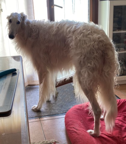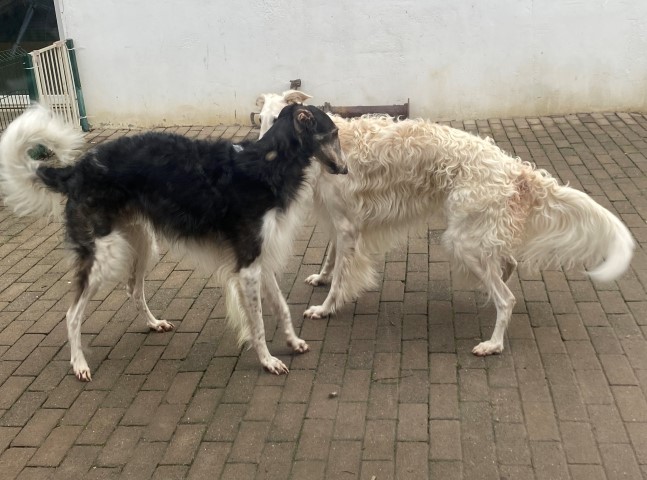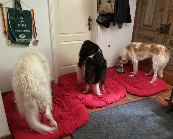 20.02.2023: Die Barsois waren dran, entwurmt zu werden! Eine große grobe Leberwurst ging dabei drauf ( zur Freude der Lieben )! In 14 Tagen noch mal, dann ist Brilliant auch mit einer Bandwurmkur dran, 3 Tage vor Abfahrt! Und dann wird reingekloppt: