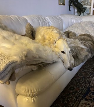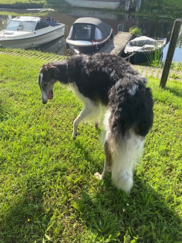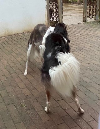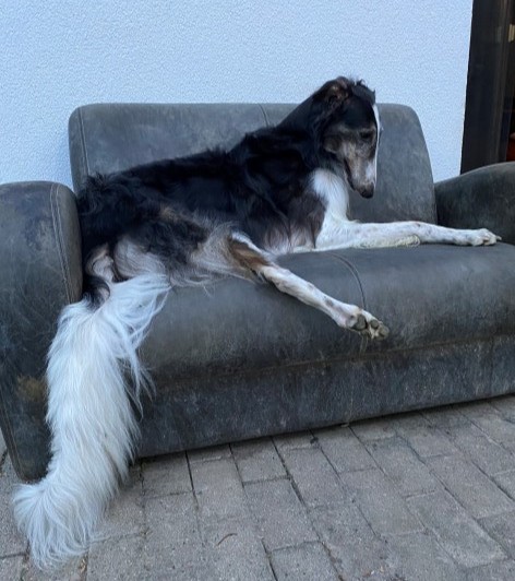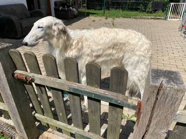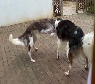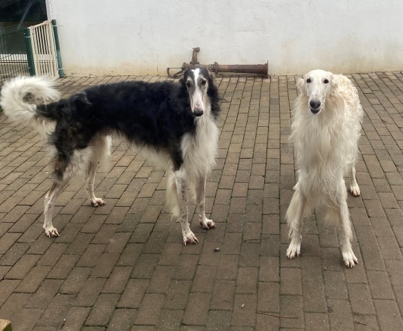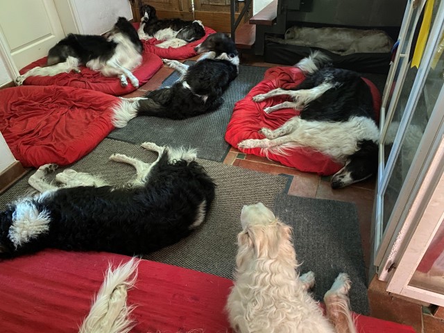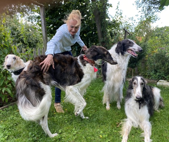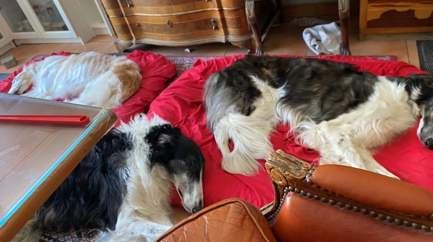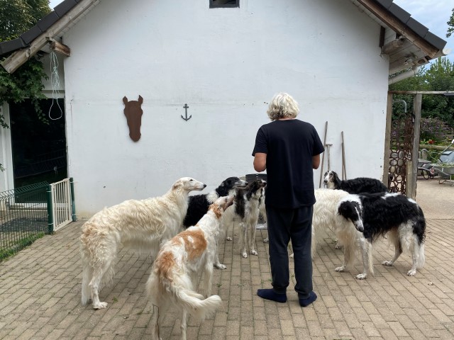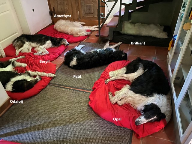 Wieder zu Hause angekommen, erwartete mich dieses Bild! 7 Barsois allein zu Haus! Was hatte ich auch erwartet bei offener Tür zur Weide und zum Paddock?