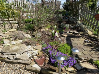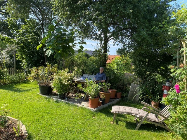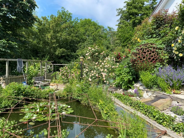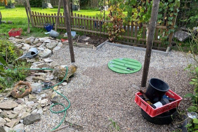 10.04.2023: Der 2. Ostertag ist angebrochen. Das Wetter ist zum verlieben, warm, läd ein, am Teich zu relaxen. Mach ich auch! Zwischendurch ein wenig Kraut zupfen. Achim will noch ein paar Fliesen legen.