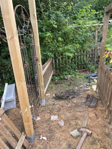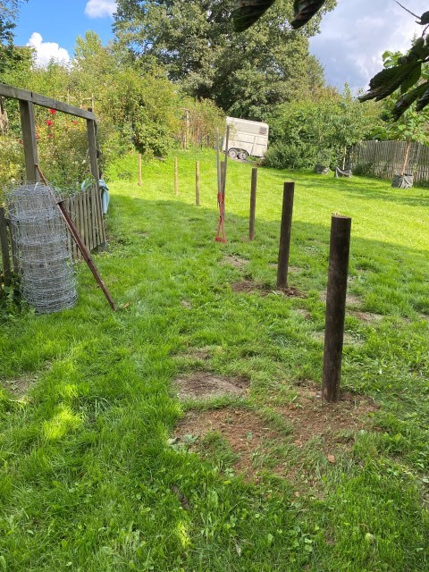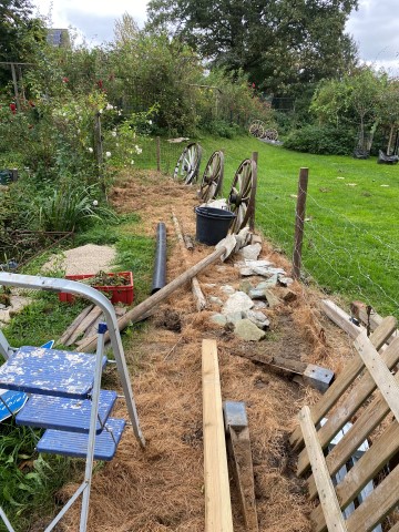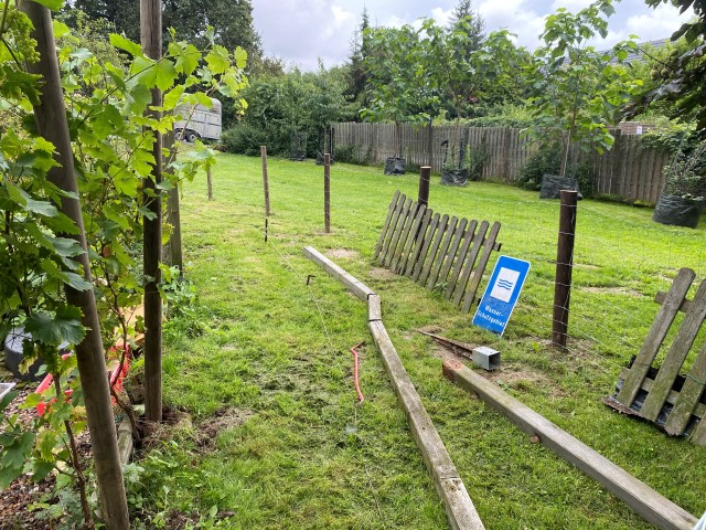 07.10.2023: Und wieder ein Stückchen weiter: Rad Nr. 5 steht! Jetzt müßten noch 5 Zaunelemente versetzt werden, doch das muß leider noch warten, Achim geht wieder an Bord.
