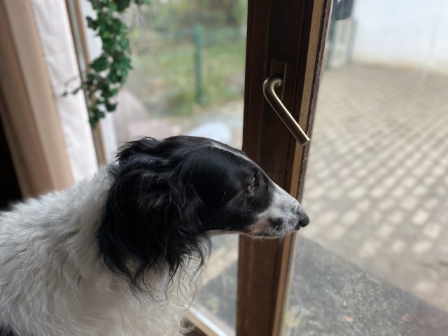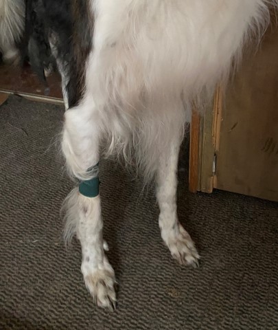 15.11.2023: Heute ist ein Tag, den keiner braucht! Beryll humpelt! Also ab zum Tierarzt. Dort wurde festgestellt, daß der Herr Sausewind sich zwischen den Ballen ein Stück Haut abgefetzt hat. Nun trägt er einen Verband. Wenn er raus will, gibt es einen Gummihandschuh darüber, damit er nicht naß wird! ich wiederhole: wenn er raus will! Und das ist gefühlt 500 mal am Tag!!!