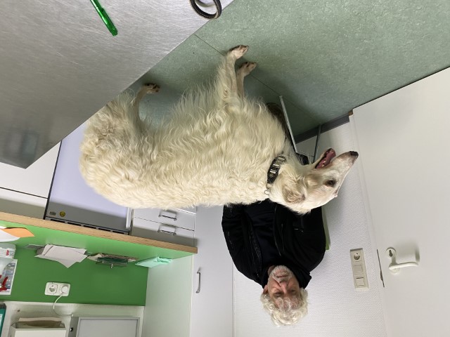 19.01.2023: Odaloij und ich müssen zum Tierarzt! Hier lag kein Schnee, die Straßen sind frei, doch im Radio melden sie schon über 300 Unfälle wegen Schee und Glätte in NRW! Wir jedoch haben nichts abbekommen. Es freut mich sehr. Da sitzen wir nun und warten auf unseren Aufruf. Odaloij wird dann gründlich untersucht, und am Mittwoch nächster Woche bekommt er eine Warze am Auge entfernt. Er ist bei der Untersuchung ganz tapfer, auch, wenn es nicht so schön für ihn ist, am Auge untersucht zu werden.