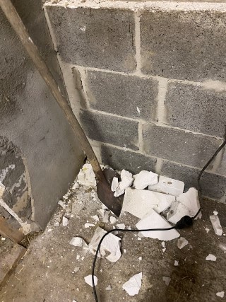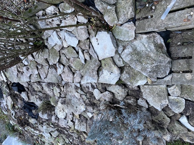 25.02.2023: Gestern ist die Wand "gefallen"! Es hat unglaublich gestaubt all die Tage, weil er ja auch flexen mußte. Und wir arbeiteten mit Atemmasken. Ich trug die Trümmer raus. Die waren richtig schwer. Das "Kleinzeug" kam in Kübel, den Rest habe ich so gestapelt. Einige Steine werden jedoch noch gebraucht.