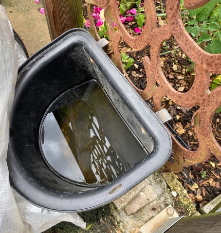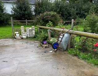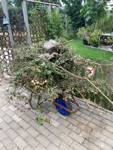 Und das habe ich entsorgt: Eine Karre Kraut und erster Rosenschnitt, ein Faß Wasserpflanzen.