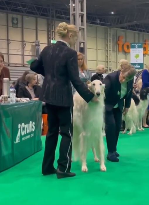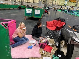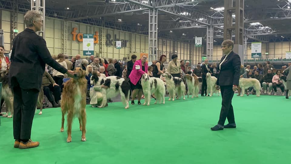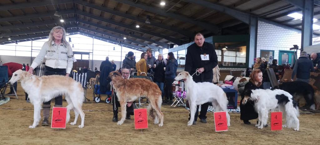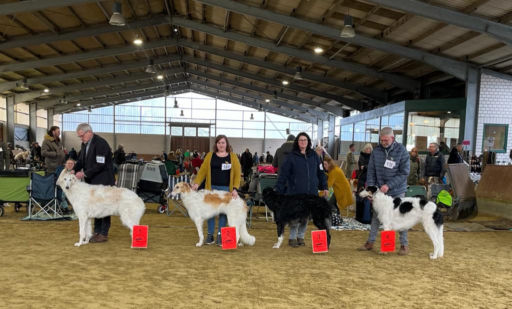 Wir mit den Barsois waren 16 in der Offenen Klasse. Brilliant hatte wohl am Morgen Flugzeugbezin getrunken. Als wir einzelnd laufen mußten, raste er derart los, so daß ich fast meinen Schuh verlor! Ich brauchte mehrere Schritte, um wieder ganz rein zu schlüpfen! Das war was!!! 5 Barsois wurden rausgesucht, das war es für uns! Immerhin unter den 16 Besten! Doch ich hatte von vorne herein nichts anderes erwartet. Interessant war, daß auf einem Video im Internet die Ringstuards zu hören waren, wie sie der Richterin ein paar Zwingernamen sagten, naja. Nachdem wir dann fertig waren, haben wir die Industrieausstellung besucht und viel gekauft!