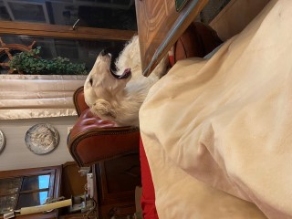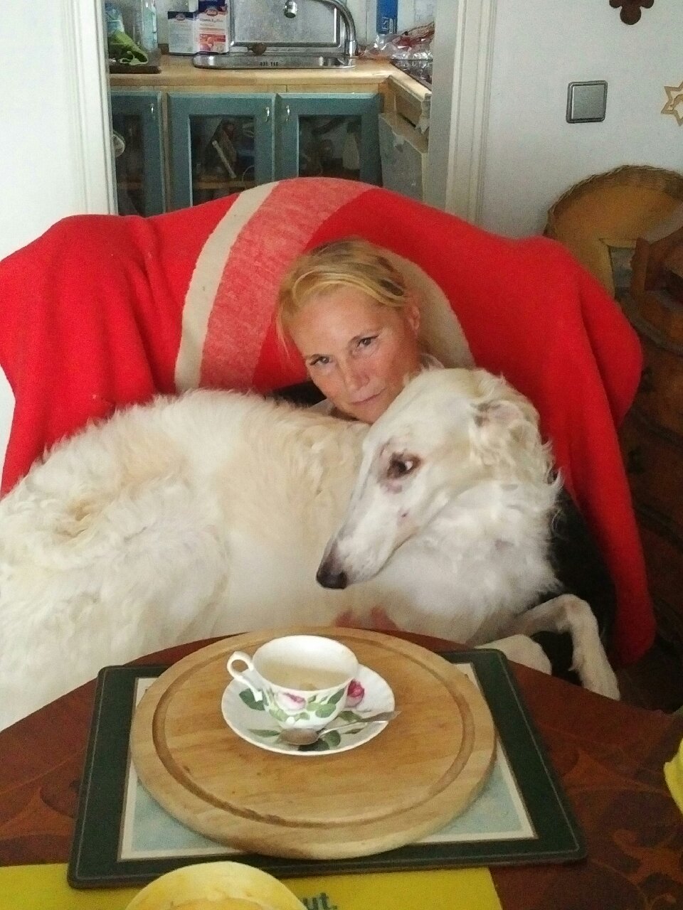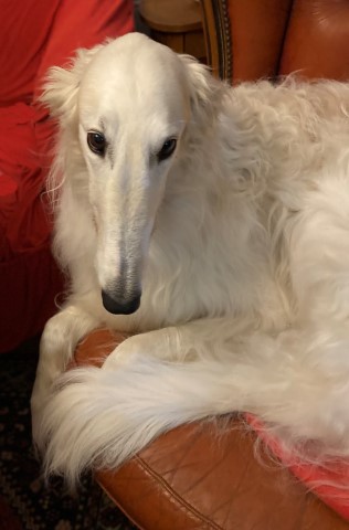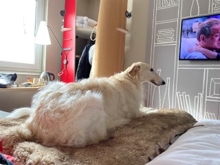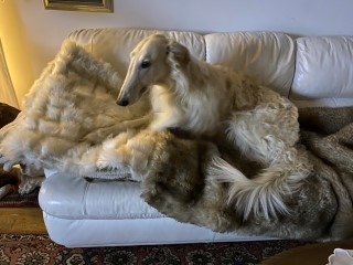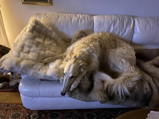 Nur wieder ein klein bißchen Kraut, dann schon wieder Regen! Die Barsois, speziell Brilliant, sitzt im Sessel. Er denkt nach!