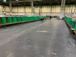Die "benchs", in denen die Hunde untergebracht werden sollen, und unser "Barsoiring". Die Ringe waren schön groß! Wir haben es uns am Rand der Boxen gemütlich gemacht.