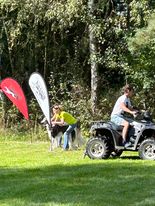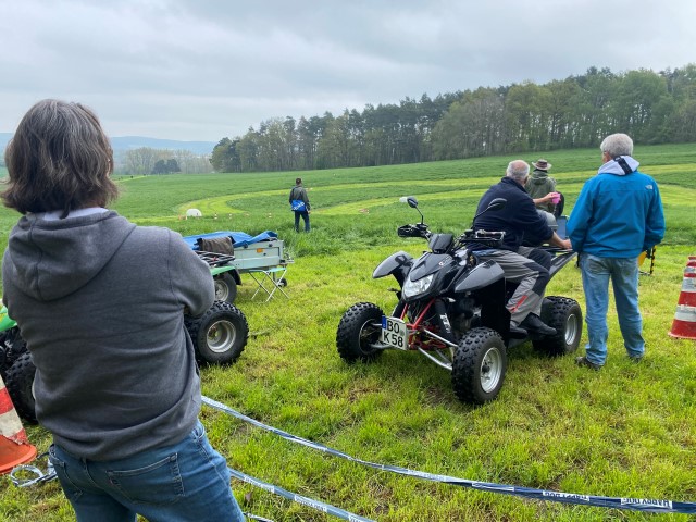 Naja, das Wetter war halt April-mäßig, doch Beryll war es egal und ich hatte Gummistiefel mit. Während der Fahrt rief mich David an und fragte, wo ich denn sei. Ich: Auf der Fahrt nach Hassia. Er: Ich dachte, das ist erst morgen! Also: Hund ins Auto und auch los! Dann kam die nächste Überraschung: Von der Autobahnabfahrt gab es eine Umleitung nach Volkmarsen! Und wie es Umleitungen so an sich haben, sind sie sehr unzuverlässig ausgeschildert! Durch großen Zufall gelangte ich zur Abfahrt vor Volkmarsen und konnte von dort aus weiter über "Land" nach Volkmarsen fahren. Als ich dort ankam, war nichts los! Oh je, hatte David doch recht? Nein, ich traf auf Heidrun, Klaus und Markus, die einen neuen Teppich verlegten. Ein Stein fiel mir vom Herzen, also GsD keine Fehlinfo an David. Nach und nach kamen noch ein paar Trainingsteilnehmer. Doch es war mehr als überschaubar, das hätte ich so nicht erwartet. Dann ging es dran, den Parcours zu stecken. Ha, waren allerdings plötzlich die Jäger zugange! Also konnten wir nicht auf die Wiese! Nun, was tun? Alle Autos wurden weggefahren und der Steinbruch mußte herhalten. Das war eine super Idee! Doch dazu mußte zuerst noch ein kaputter Baum gefällt, zerlegt und weggeräumt werden.