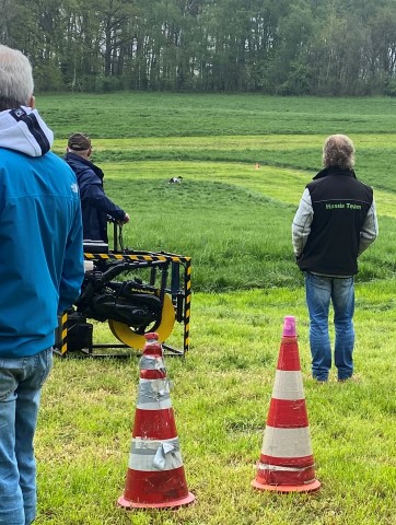 Und es gab eine funkelnagelneue Hasenzugmaschine! Schön leise und ganz leicht zu bedienen! Sie startete auf "Knopfdruck"! Alle waren begeistert. 2 x wurde ohne Hunde gezogen, um die Bedienung sicher zu können, dann ging das Training los. Inzwischen war es schon nach 13 Uhr, doch, wie gesagt, wir waren wenige. 2 Podencos liefen zuerst, dann Knjaginia. Dann sollten 2 Greys laufen, einen startete ich. Doch wir warteten und warteten! Also Abbruch und hin, sehen, was los war. Der neue Hasenzug sprang nicht mehr an. Alle Bemühungen halfen nicht, der Anlasser war und blieb kaputt! Wie gut, das es noch den alten gab!!!