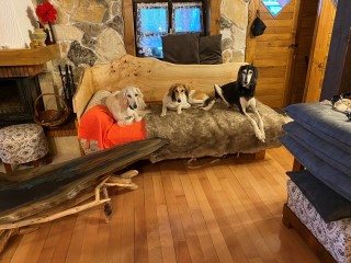 Da liegen sie in einer Reihe: vorne Amethyst, sein Sohn Brilliant und Opal`s Sohn Beryll, 3 unserer 4 "Edelsteine" und 3 unserer 6 Lieblingshunde! Mehr haben wir ja auch nicht.