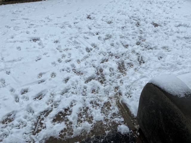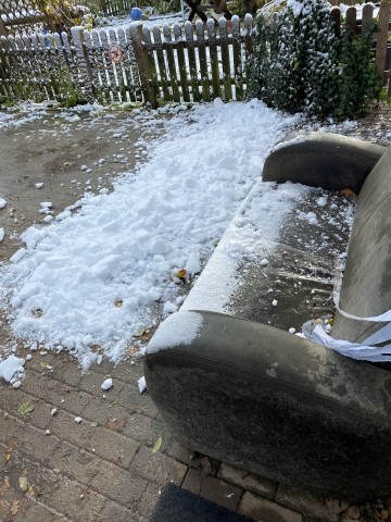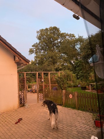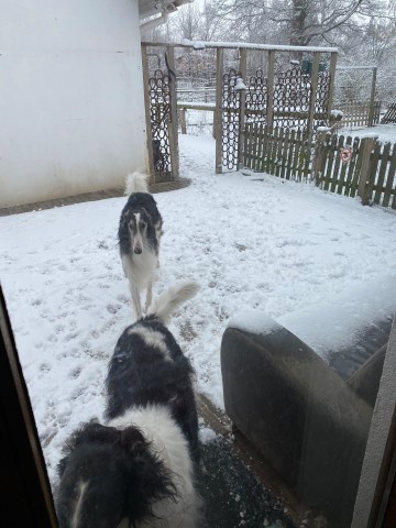 28.11.2023: Gerster Abend begann es zu schneien! Und heute morgen sauste dann eine Dachlawine von der Solaranlage runter! Hui, haben sich die Barsois erschrocken, so schnell konnte ich gar nicht filmen, wie sie weg waren!