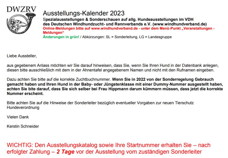 03.12.2023: Die Termine für Ausstellungen, Rennen und coursings sind bekannt, auch die internationalen Termine stehen fest. So haben wir uns kurzgeschlossen und überlegt, wohin die Reise im nächsten Jahr gehen soll. Wir freuen uns schon sehr, wenn es wieder los geht!