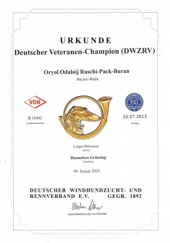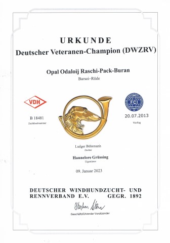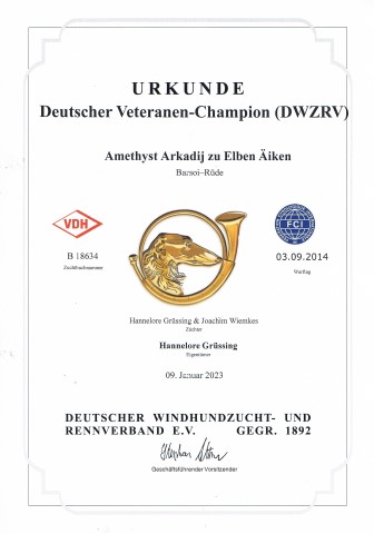 11.01.2023: Endlich sind auch sie da, die Veteranen-Championatsurkunden DWZRV für Amethyst, Opal und Odaloij! Jetzt warte ich nur noch auf Amethyst`s VDH-Vet.-Championatsurkunde! Doch die sind ja immer recht schnell.