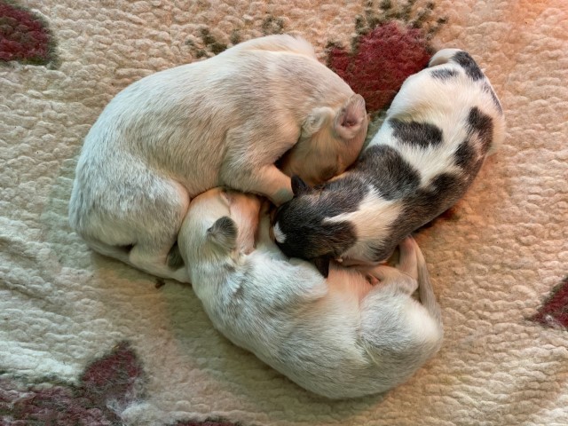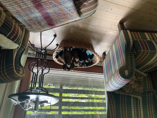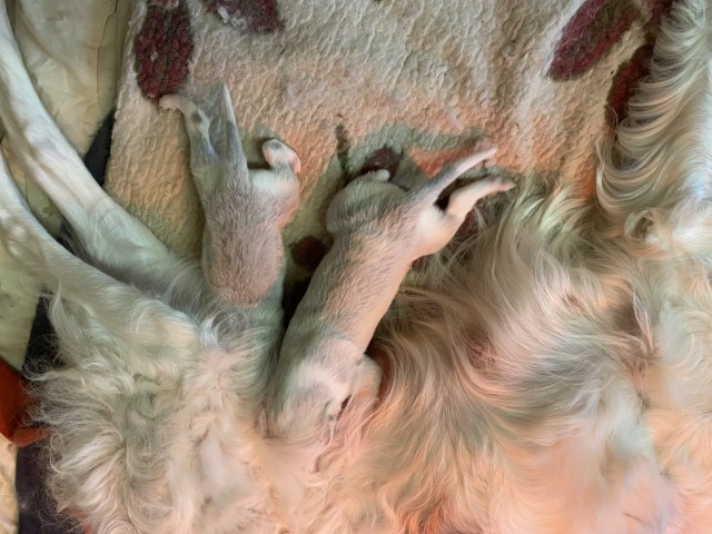 Hier liegen 2 Vertreter aus Wurf A & B. Beide sind tolle Jungs, das ist o. K.! Der eine ist dunkel, der andere hell! Der Helle hat viel, der Dunkle wenig Fell!