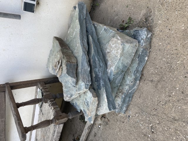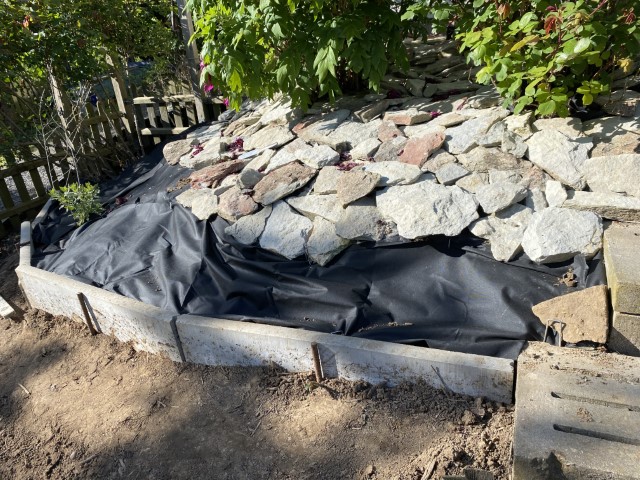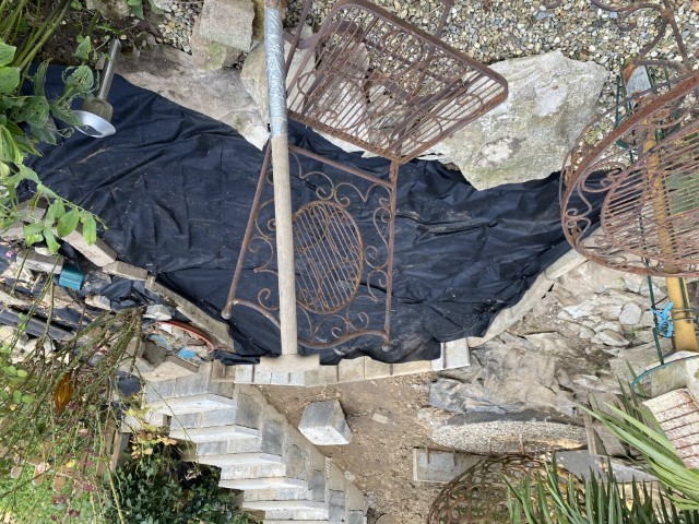 Die letzten Kantsteine werden eingegraben, und morgen will Achim einen kleinen Weg bis zur Treppe zum Rasen hin pflastern. Ich habe die Steine dafür schon aufgestapelt.