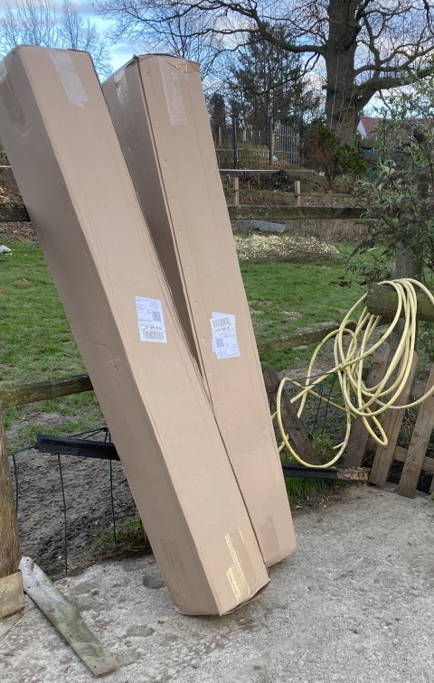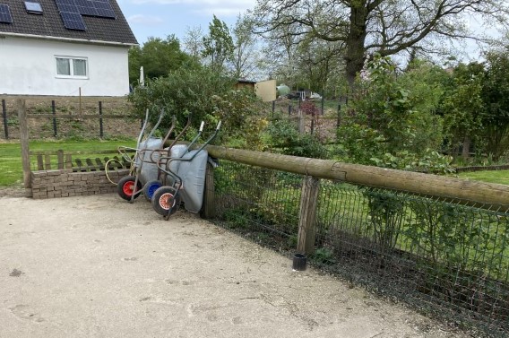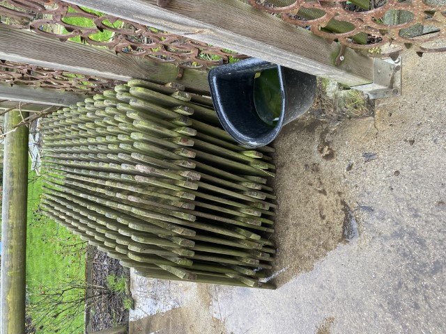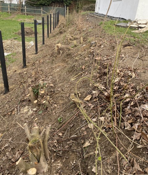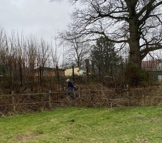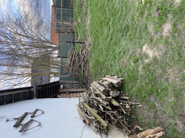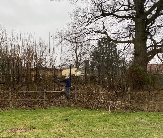 23.02.2024: Die abgeschnittene Hecke wird geschreddert und die dickeren Stämme werden gestapelt, um zu Brennholz geschnitten zu werden. Die Paddockpfosten sind raus, das Eichenholz wird sicher auch gut brennen. Ein Teil der Umzäunung kann noch verwendet werden, sehr schön!