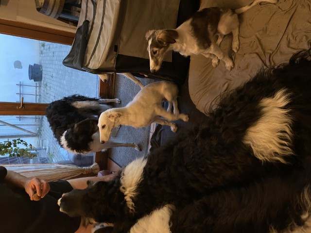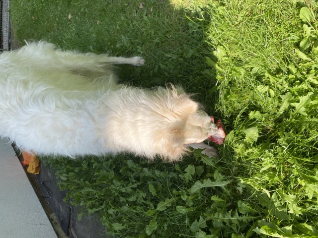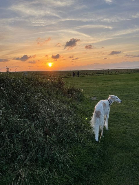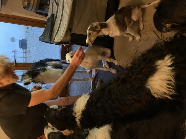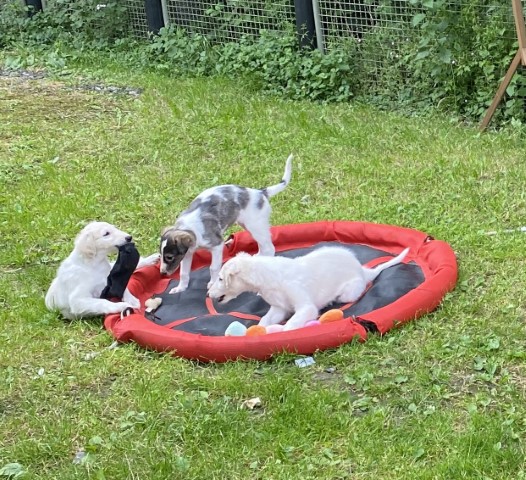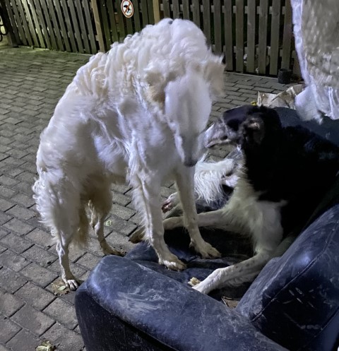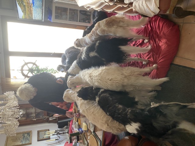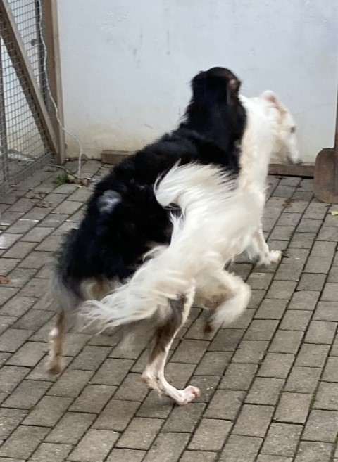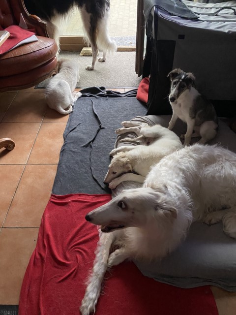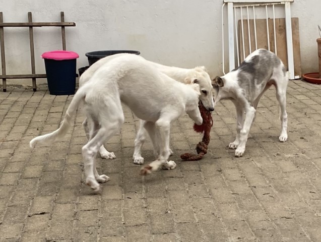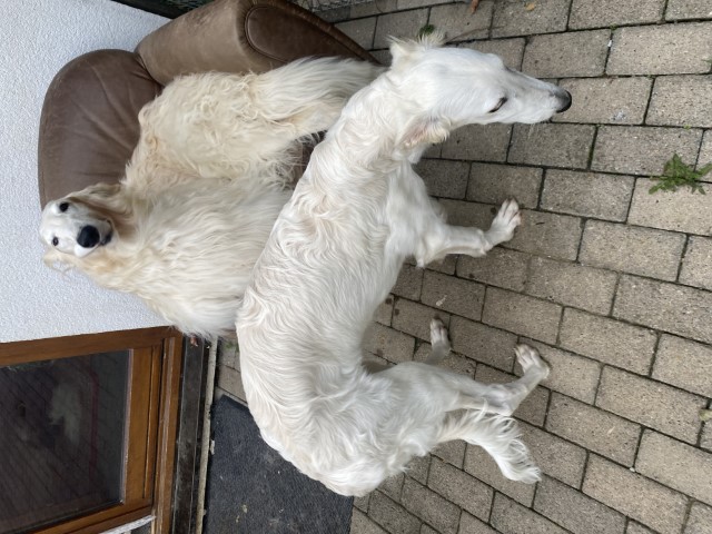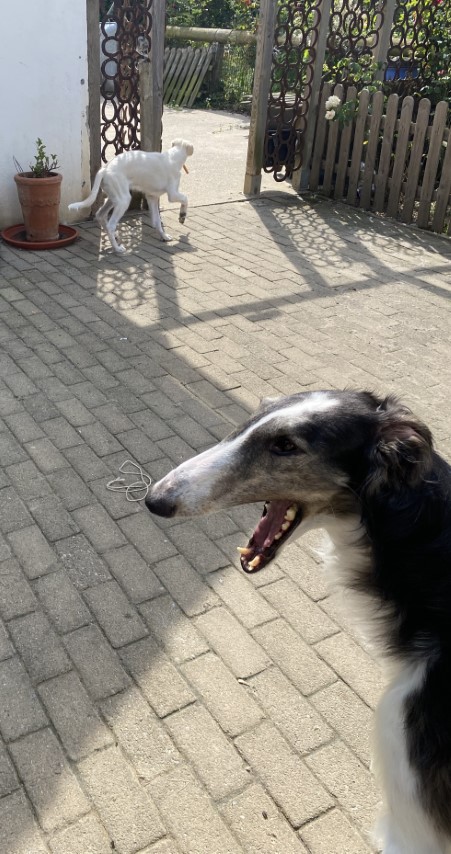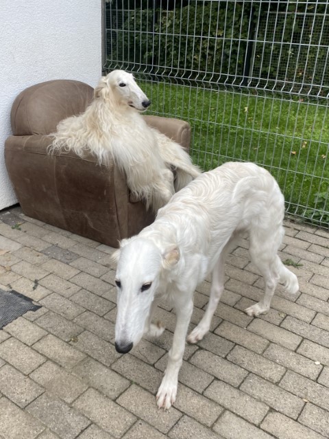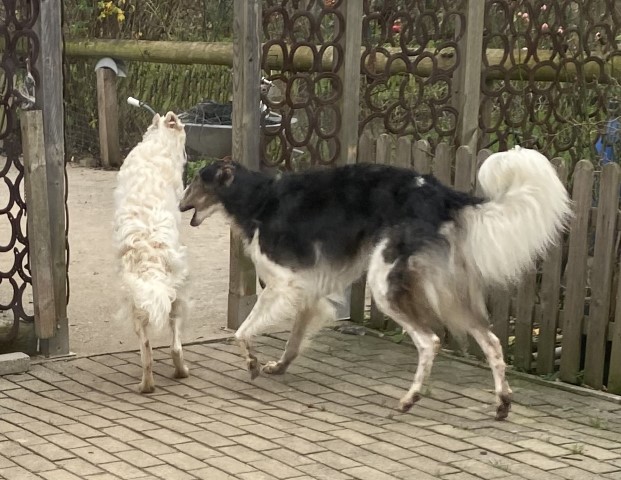 14./15.10.2024: Es ist 24:00 Uhr! Ich habe jetzt mein Geschenk von Achim geöffnet und trinke auf uns und unsere Hunde! Und auf ein paar liebe Freunde. Ich bin recht wehmütig, so "Menschen - allein". In Dinklagen hatten wir zu solchen Anlässen immer das Haus voll und feierten auf der Tenne bei den Pferden. Hier in Soest ist alles ein wenig, um nicht zu sagen, viel kleiner, die Wege sind zu weit. Ich vermisse unsere Dinklager Nachbarfreunde, unsere Familie und unsere Freunde! Es ist gerade auch hart, daß Achim an Bord mußte! Das macht so gefühlt verletzlich, hier mit den Hunden alleine zu sitzen. Doch dann erhebe ich mein Glas und sage laut: "Hart ist das Leben an der Küste, und hart sind die Frauen, die es meistern!" Danach geht es mir wieder besser, weil ich weiß, daß das wahr ist! Ich schaue unsere Barsois an und bin glücklich, daß sie mich/uns durch`s Leben begleiten! Ich hoffe, daß meine "Rentner" noch lange an meiner Seite sind, und die Jungen in die Fußstapfen ihrer Väter und Mütter treten. Und wenn nicht? Ist auch nicht schlimm, wir lieben sie trotzdem! Ich habe in meinem Arbeitsleben gezeigt, wer ich bin und was ich kann, deshalb brauche ich mich jetzt - privat - nicht mehr über unsere Hunde definieren! Die sind und bleiben Familie, und ihre Aktivitäten ein Hobby! Und das macht mich froh und auch frei! Und so gehe ich jetzt schlafen und freue mich sehr auf meinen Besuch heute Nachmittag! 14.10.2024: Ich habe alles geputzt, morgen nur noch die Fußböden in Küche und Flur wischen und die Matten austauschen, dann ist alles o. K.. Wer uns besucht, muß mit unseren Hunden rechnen, da ißt man nicht vom Fußboden, weil da nichts zu finden ist, denn: Was unten liegt, ist unseres! Nein, weil, wer unsere haarige Familie nicht akzeptiert, braucht uns nicht besuchen. 13.10.2024: Er kann es nicht lassen! Wie viel Kraft er doch im Gebiß hat! Und Papa Brilliant schaut zu! Das kleine weiße Ungeheuer!