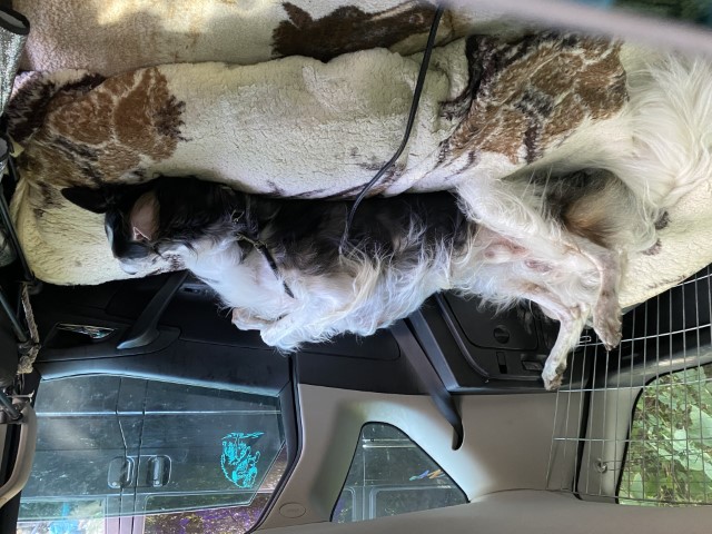 Da liegt er auf seiner Decke und denkt wahrscheinlich: Warum muß ich hier bloß sein? Ich dachte, wir fahren coursen!