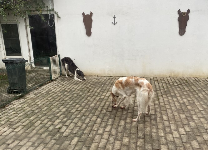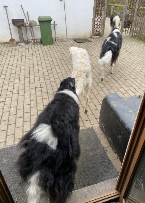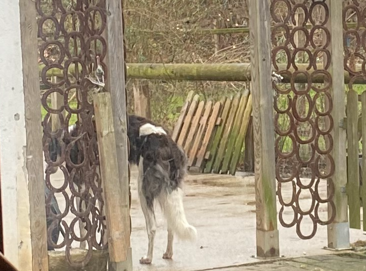 15.02.2024: Bubu ist läufig! Eine Phalanx begleitet sie seit gestern auf all ihren Wegen. Am Samstag geht sie in "Quarantäne"! Ich kann mir gut vorstellen, daß die ohnehin schon langen Barsoigesichter dann noch länger werden! Heute nachmittag hat es mal nicht geregnet, ich habe Maiglöckchen gepflanzt!