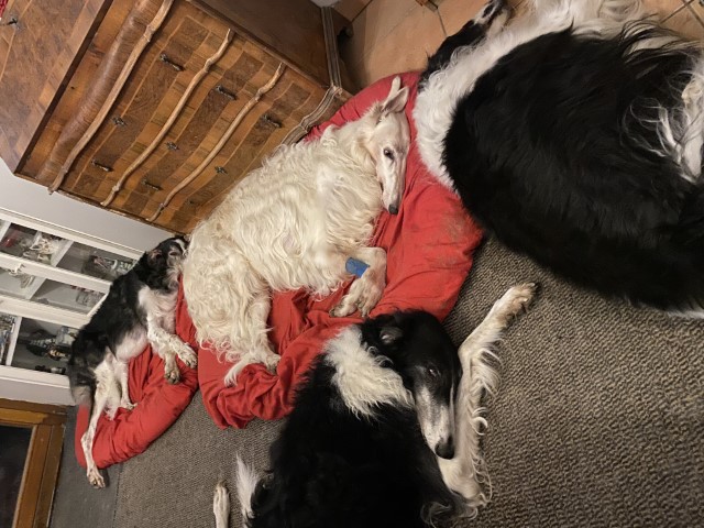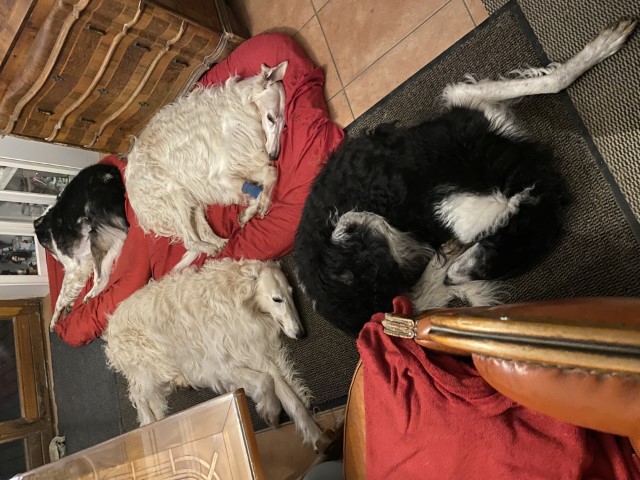 Ich werde immer wieder gefragt, was ich mache, wenn an Silvester die Böller knallen und die Hunde vor Angst fast sterben! Ich muß gestehen, ich weiß darauf keine Antwort! Ich bin so sehr froh, daß die unsrigen nicht so extrem reagieren! Viele müssen ihren Tieren Medikamente geben, damit sie die Silvesternacht überstehen, wie schade ist das! Warum muß in der heutigen Zeit nur noch so "geknallt" werden? Inzwischen weiß doch jeder, daß es für alle Tiere schlimm, sogar lebensgefährlich ist!!!! Wie viele Vögel sterben deshalb! Ist es das wirklich wert? Alle jammern wegen gestiegender Kosten, doch für solch einen Sch..ß ist immer noch Geld genug! Also kann es uns gar nicht so schlecht gehen, wie immer "geklagt" wird! Naja, das ist eine andere Geschichte! Also wieder zurück zu unseren Hunden ( und Katzen ) in der Silvesternacht. Ich kann da immer nur vermuten, da ja auch viele Angst vor Gewitter haben. Sie wissen einfach nicht, woher das kommt, denn sie können die Ursache nicht zuordnen, lokalisieren! Und vielleicht, weil wir um das Problem wissen und deshalb große Angst vor der Reaktion unserer Tiere haben, überträgt sich unsere Angst auf diese. das ist eine mögliche Erklärung. Unsere Barsois leben mit uns, und ich schaue liebend gerne Krimis! Somit ist ihnen die "Knallerei" nichts Unbekanntest! Möglich, daß beide Punkte zu einer relaxsten Situation beitragen, ich kann das nicht sagen, nur vermuten. Das "Urvertrauen", das unsere Barsois uns entgegen bringen, ist etwas, was ich hoffe, nie enttäuschen zu müssen! Wir lieben unsere haarige Familie!