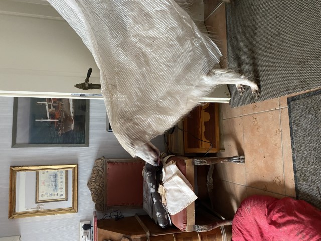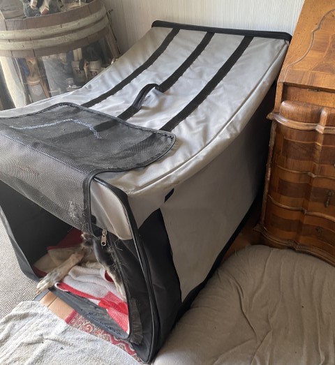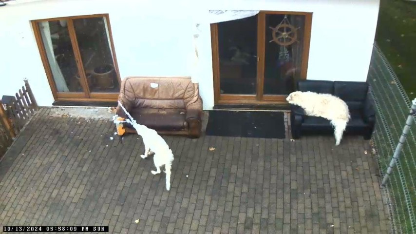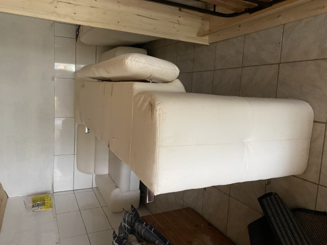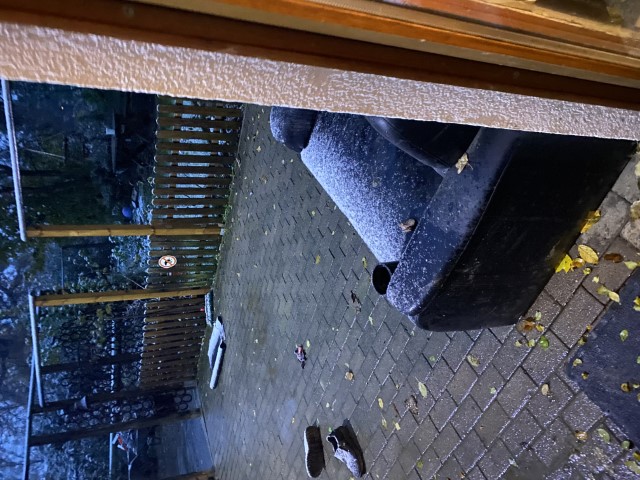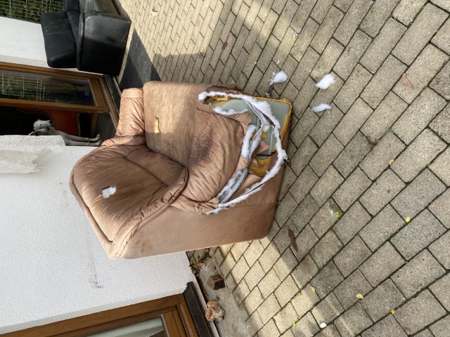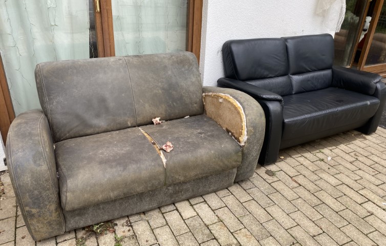 12.10.2024: Vorgestern haben wir den verbliebenen Sessel noch gegen ein weiteres 2-er Sofa ausgetauscht! Heute ist es Müllplatzreif! Und mit welcher Kraft Corund es angeht! Zieht das schwere Sofa sogar von der Wand!