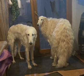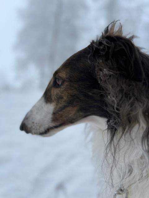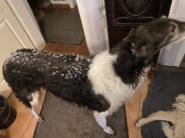 17.01.2024: Die Wettervorhersage war und ist schon arg: Eisregen und Blitzeis, extreme Glätte, Schneefall! Wir hatten bislang noch Glück! Es schnei-nieselte sich ein, und so haben auch wir eine weiße Winterlandschaft. Die Barsois hatten Spaß! Wenn sie wieder rein kamen, waren sie Schnee bedeckt!
