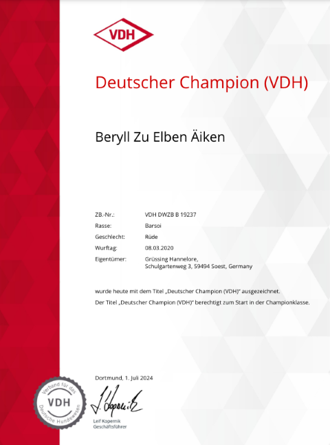 Der Amethyst, liebenswürdig, edel, klug! Sighthound of the Year 2017 in Schönheit und Leistung Dt. Vet.-Ch. VDH, Dt. Vet.-Ch. DWZRV, Dt. Ch. S & L, Dt.Ch. VDH, Dt. Ch. DWZRV, Dt. Jgd-Ch. DWZRV, Dt. Jgd-Ch. VDH, DWZRV Coursing-Ch., LU-C, CACIL-Prüfung, Verbandssieger 2019, Landessieger Niedersachsen-Sachsen-Anhalt 2019, DWZRV-Sieger 2018, DWZRV-Sieger S&L 2018, Landessieger Weser-Ems 2018, German-Winner 2016, Alpensieger 2016, ( Sieger Baden-Württemberg 2016, Sieger Karlsruhe 2016), Landesjugendsieger Weser-Ems 2015, Landesjugendsieger NRW 2015, Bundesjugendsieger 2015, Q. f. crufts 2016, Prädikatskörung für Schönheit und Leistung DM-frei, DCM-frei Leistungsurkunde Coursing, CACIL-Prüfung, FCI-coursing-Lizenz Ranglistengewinner Ausstellung 2016, Ranglistengewinner Coursing 2017 V1, VDH, CAC, Bester Rüde, Anniversary Winner Donaueschingen 2018, aus der Gebrauchshundeklasse heraus!