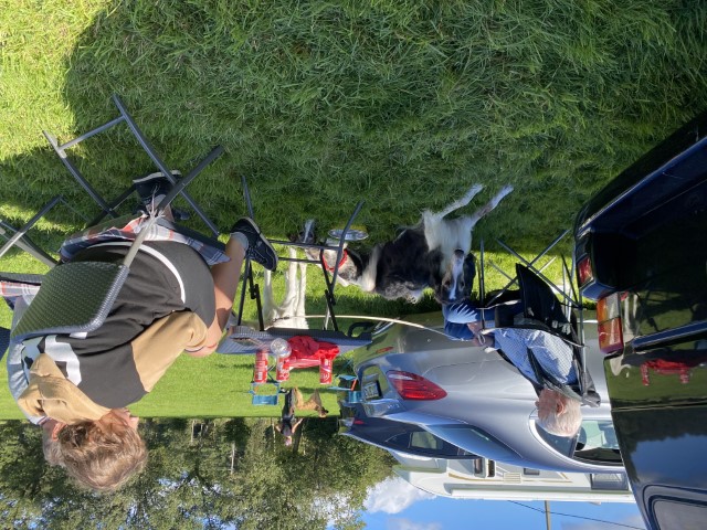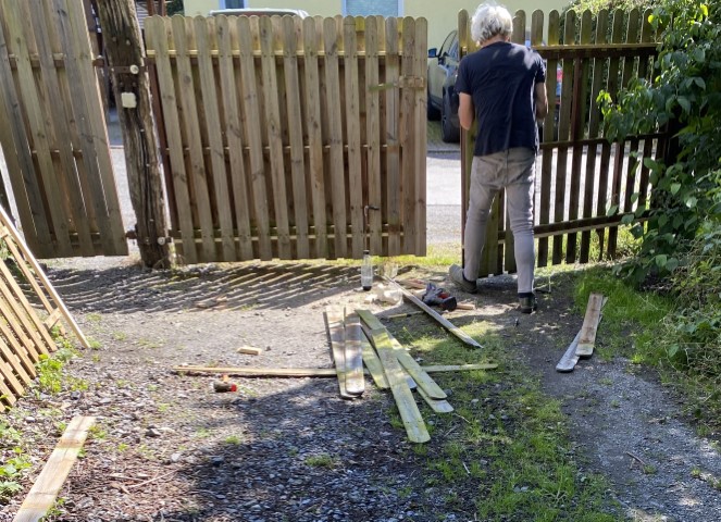 Der Anhänger schwerst beladen, auch die Autorückbank wurde noch voll! Danke, liebe Britta, lieber Bernd und lieber Jürgen! Es war ein schöner Tag mit Euch! Derweil hat Achim im Garten weiter geschuftet!