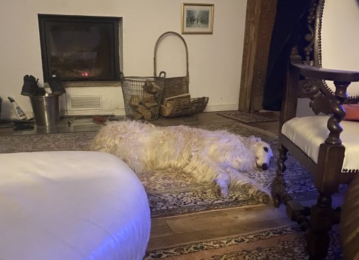 Paul findet es gemütlicher, vor dem Kamin zu liegen!