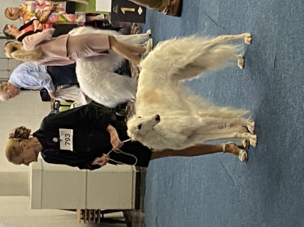 Wir fanden einen schönen Platz und freuten uns, von vielen lieben Hundefreunden gegrüßt zu werden. Dana und Corund sind ganz entspannt und warten auf ihren Einsatz! Ich habe mich sehr über Dana gefreut, denn sie lief fine und stand auch sehr gut! Sie ist ein farbliches Highlight unter all den überwiegend hellen Hunden.