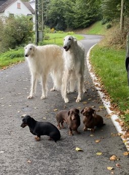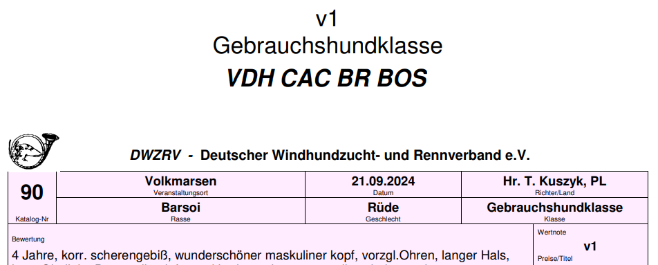 Ein sehr freundlicher Richter mit viel Einfühlungsvermögen für unsere jungen Barsois. Herzlichen Dank für die tolle Wertschätzung unserer Hunde. Auch die "Buckelige Verwandschaft" schnitt vorzüglich an: