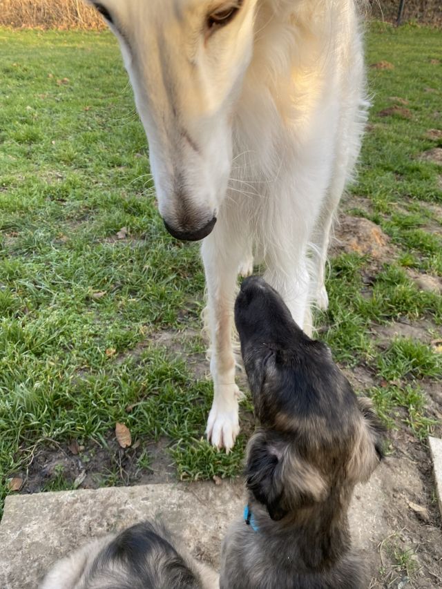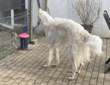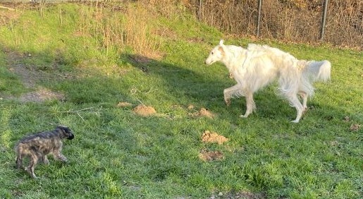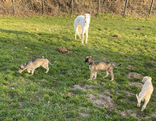 13.12.2025: Heute war wieder ein wichtiger Tag im Welpenleben: Wurfabnahme! Um 10:00h wollte Dietmar zur Wurfabnahme kommen. Das bedeutete für mich, alles muß schnell gehen, also KEINE Besen-und Schrubberspielchen mit den Welpen, was sie so gerne machen. Und wenn man schnell sein will, macht man Fehler! 1. Corund war nicht im Haus, 2. das Welpengehegetor war nur angelehnt. Und dann kam Corund aus dem Paddock zurück, das kleine Volk sah ihn und schwupps, alle durch das Tor: Corund begrüßen! Corund in voller Panik: "Was wollen die denn von mir? Nix wie weg!!!" Und dann ging die "Barsoischwanz-Jagd" los. Oh Heimat, bis ich die dann endlich alle wieder hatte!!! Der arme Corund! Er tat mir soooo leid! Doch das kommt davon, wenn man immer vor dem Zaun steht und die Kleiden anspielt.
