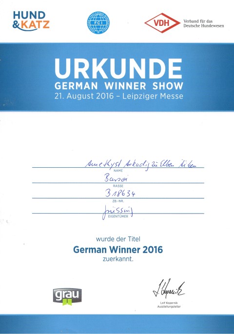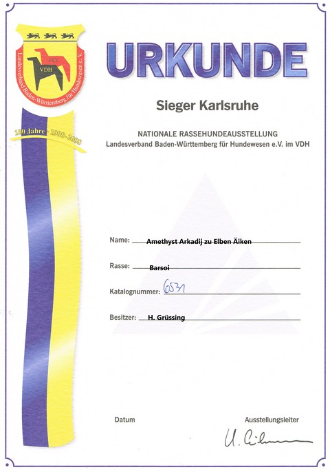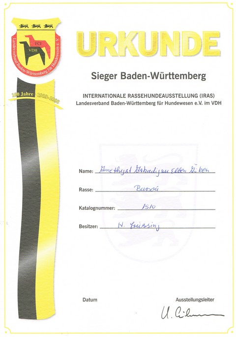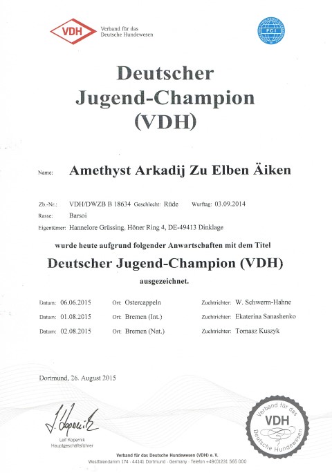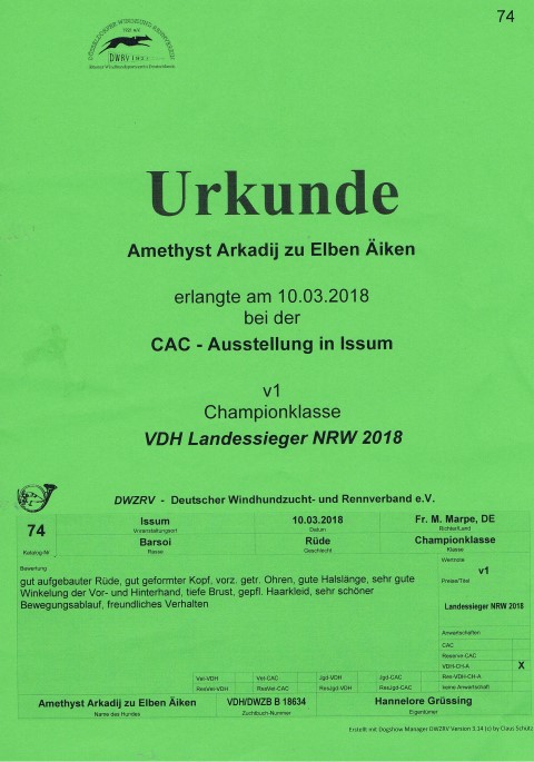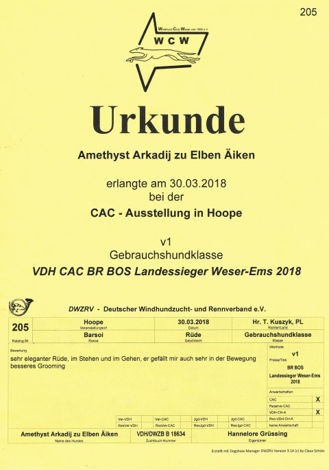 ![]() Verbandssieger, BOB und DWZRV-Sieger-BIS! Landessieger Niedersachsen-Sachsen-Anhalt 2019 ![]() Rangliste Ausstellung 2018: Mit sehr wenigen Ausstellungen auf Platz 3! DWZRV-Sieger S&L 2018, Ranglistengewinner Coursing 2017, Ranglistengewinner Ausstellung 2016, Sighthound of the Year 2017 in Schönheit und Leistung ( das Zuchtziel des DWZRV ) V1, VDH, CAC, Anniversary Winner Donaueschingen 2018, BOS aus der Gebrauchshundeklasse heraus!