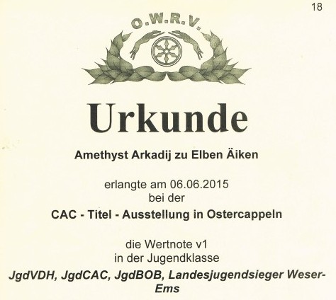 3 x Pl. 4 5 x nicht in der Ch.-Klasse ausgestellt: 5 x V1, 4 x CAC, 1 x Res.-CACIB (Amethyst hat sozusagen seine Championtitel in 2017 noch einmal gemacht!!)