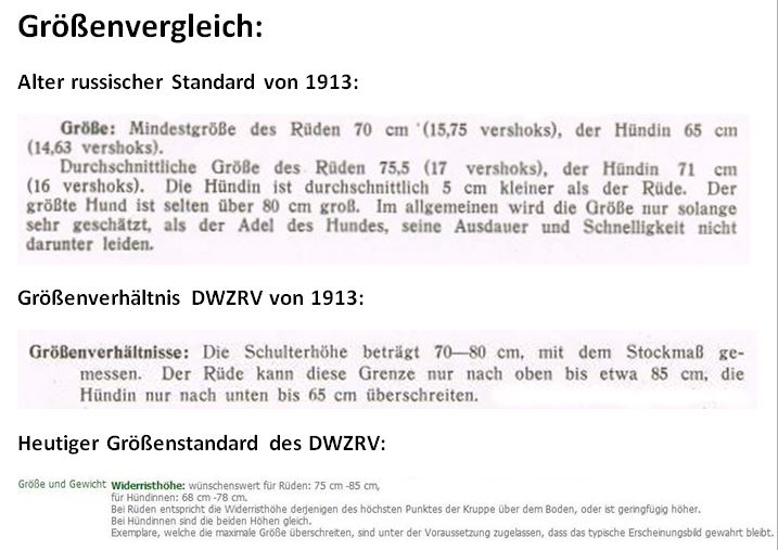 wurden in der Fachzeitschrift American Naturalist veröffentlicht. __________________________________________________ Größenvergleich zwischen dem russischen Standard, dem des "Allgemeinen Deutschen Windhundclubs", aus dem der heutige DWZRV hervorgegangen ist, und dem heute gültigem Standard des DWZRV: Jetzt gibt es einen neu überarbeiteten Standard, in dem es als Fehler gilt, wenn die Größenangaben 2 cm über- oder untersteigen!!! Das ist eine Verbesserung! ______________________________________________________________ Der russische Barsoirichter-und Barsoikenner General George de Meyer schrieb über die Größe unserer Barsois folgendes und bezieht sich auf die Größenangaben von 1913 ( nicht auf die heutigen!!!!): ![]() ______________________________________________________________ ![]() Der Chortaj ( Hotaya Borzaya, auch Hort, Horty genannt ) ist ein russischer Windhund, der von Jägern gezüchtet wurde/wird, und immer noch im Schatten des Barsoi steht. Weshalb ich den hier mit ins Spiel bringe? Nun, die Begründung der Größenrange! Hier heißt es: "Der ideale Jagdwindhund muss zwischen 60 und /0 cm Schulterhöhe haben, wie der Verwendungszweck es verlangt. Der zu kleine Hund kann Füchse und kleine Antilopen nicht greifen, aber der zu große Hund ist nicht wendig und hat auf hartem Grund weniger Stehvermögen, so daß er nicht so ausdauernd jagen kann, wie es notwendig ist. ( nachzulesen in der UW November 2013 ) Das gilt letztendlich auch für den Barsoi. Nicht, dass der jetzt ca. 10 cm kleiner sein soll, wie er jetzt ist, denn er ist inzwischen hier bei uns eher der Showhund geworden. Auch braucht er die Ausdauer eines Chortajs nicht in dem Maße, da er anders jagt. Doch die russischen Jäger, die mit den Barsois auch heute noch zur Jagd gehen, schätzen die Größen um 75-78 cm Stockmaß! Genau, aus oben beschrieben Gründen! Das sollte uns zu denken geben!!! Aus der Erfahrung heraus sollte gesagt werden, dass "alte" Rassen auch alt werden. Das sieht man in der Pferdezucht ebenso, wie auch bei den Windhunden. Ponys und Vollblüter werden im Vergleich zu den Warmblutpferden sehr alt, und das hat mit ihrer Größe nichts zu tun, denn so klein sind ja Vollblüter nicht. Windhunde, auch größere wie der Barsoi, werden auch alt. Unsere Barsois werden normalerweise 12 Jahre und älter. Ich kenne Barsois von uns, die 14 - 16 Jahre alt wurden. Da die Irish Wolfhounds als die größte Windhundrasse eine eher kurze Lebensdauer haben, sollte man über sie wissen, dass die ursprüngliche Rasse ausgestorben war. Captain George Augustus Graham ![]() ( 06.08.1833 - 21.10.1902 ), ein britischer Kynologe, hat diese Rasse ab 1862 neu entstehen lassen aus einem "Gemisch" verschiedener Hunde-und Windhundrassen, auch Barsois, die Größe wurde u. a. über das Einkreuzen von schweren Doggen erreicht. Wissenschaftlich ist noch nicht belegt, ob es sich bei den ursprünglichen Irish Wolfhounds wirklich um eine "eigene" Rasse handelte, oder ob sie nicht nur eine Größenselektion der Deerhounds war. Der Maler Paulus Pieterszoon Potter ( gest. am 17.01.1654 ), ein niederländischer Landschafts - und Tiermaler, malte zwischen 1650 und 1652 ein Bild von einem "Wolfshund". Das war ca 210 Jahre, bevor Captain Graham die Rasse neu erschuf. Man darf davon ausgehen, dass damals diese Hunde noch nicht ausgestorben waren.