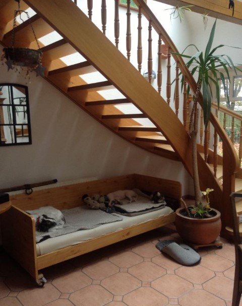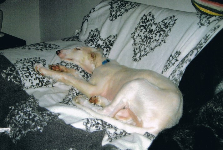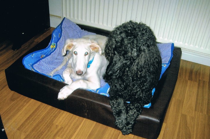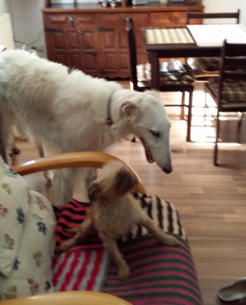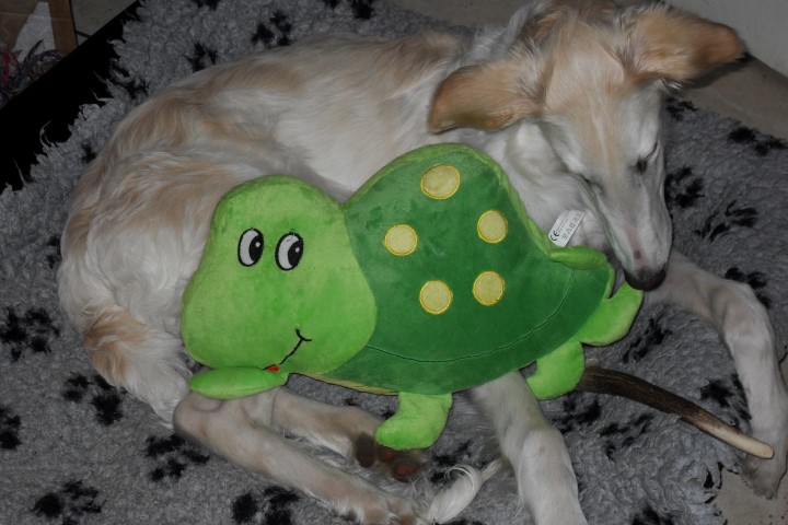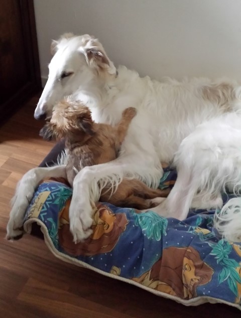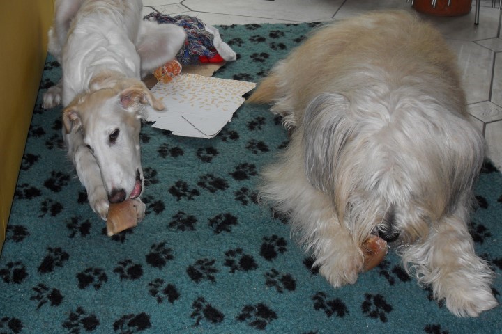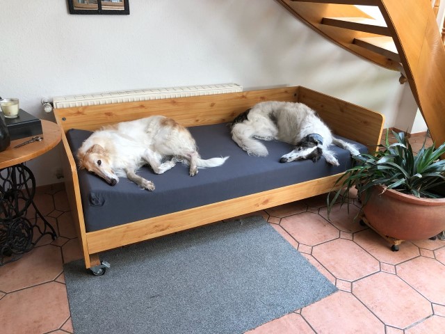 Zu Hause hat er erst alles inspiziert, dann ordentlich gefuttert, mit seiner neuen Menschen-und Barsoifamilie einen Pipi-Spaziergang gemacht und ist danach zufrieden ins Bett gegangen.