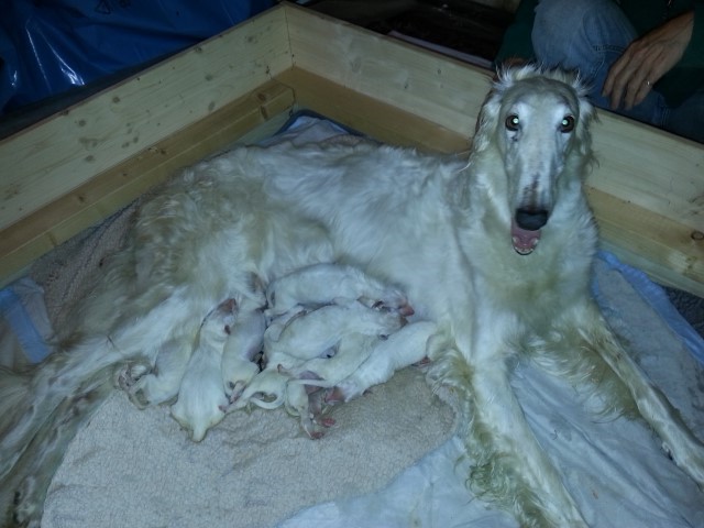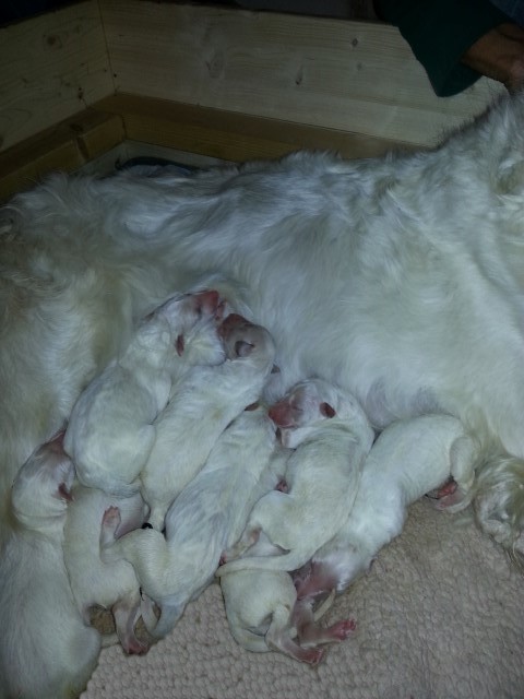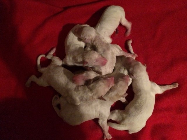 Die Eltern: Niemen & High Society Sowohl Niemen als auch High haben einen liebenswerten, freundlichen Charakter und ein einwandfreies Exterieur. Beide sind auf DM getestet und frei, somit sind auch die Welpen DM-frei. Regelmäßige tierärztliche Untersuchungen begleiten die Aufzucht unserer Welpen. 03.09.2014: Die ersten Stunden! 8 Welpen ( 5/3 ), eine ganz reibungslose Geburt, alle Welpen waren sofort schwer beschäftigt an der Milchbar! Der Nachkömmling ist noch nicht auf dem Bild! => 6/3 Unsere interne Sattelkammer in der Doppelfunktion "Welpenzimmer", denn hier hat High Blick zur Küche und freien Zugang, wenn die anderen draußen sind, ich habe sie im Blickfeld und sie hat außerhalb der Wurfkiste viel Platz für sich. High hat sich ihr "Nest" zusammengerückt, nicht sehr schön, doch, wenn sie es so will.... !