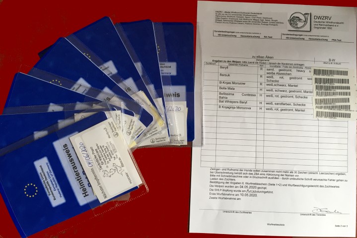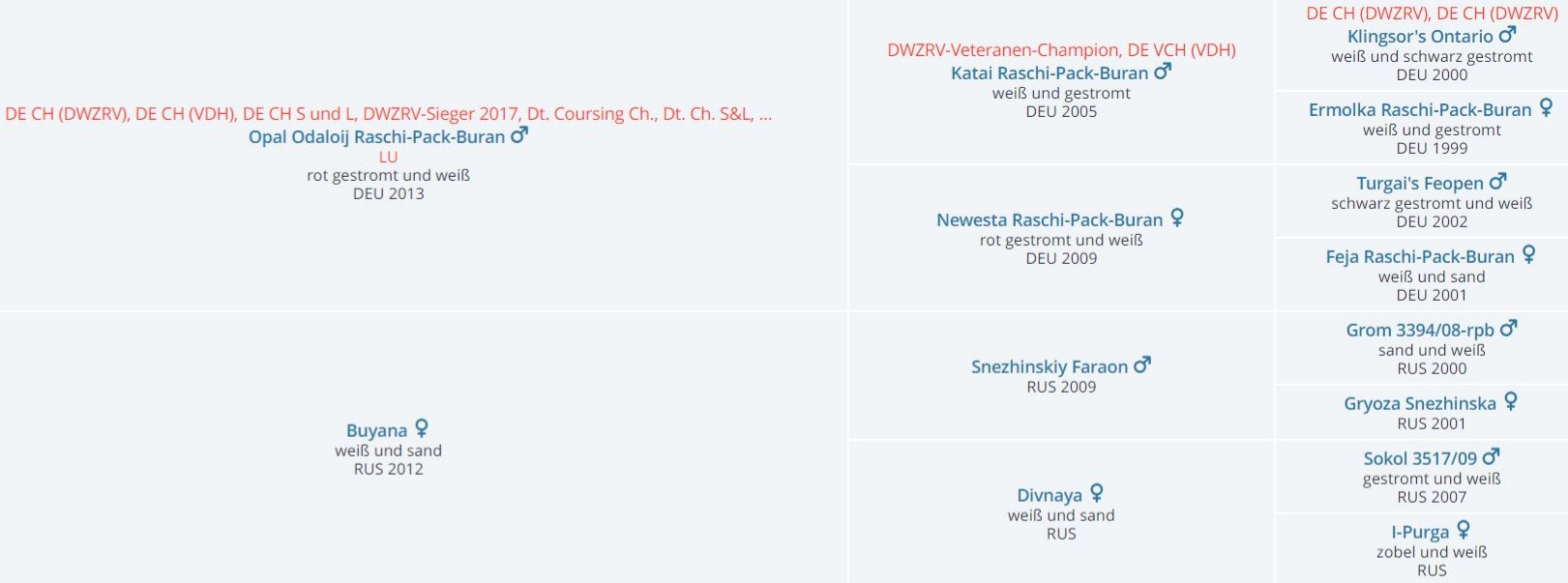 Opal Raschi-Pack-Buran, 20.07.2013, B18481Prädikatskörung für Schönheit & Leistung, Dt. Champion VDH, Dt. Champion DWZRV, Dt. Champion Schönheit & Leistung, DWZRV-Coursing-Champion, DWZRV-Sieger Schönheit & Leistung 17, DWZRV-Sieger Schönheit &Leistung 2017, Leistungs Urkunde-Coursing, CACIL-Prüfung, Dt. Jgd-Ch. VDH, Dt. Jgd-Ch. DWZRV, Frühjahrsjugendsieger Dortmund 2014, LJS NRW 2014 Wellhaar, rot, d. gestromter Mantel, DM-heterocygot Buyana, 12.06.2012 ( Diplomierte russische Jagdhündin, DM-Status: N/N )Wellhaar, weiß mit roten ( cremefarbenen ) Platten.