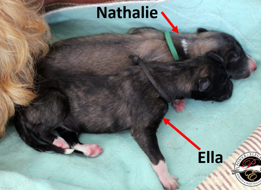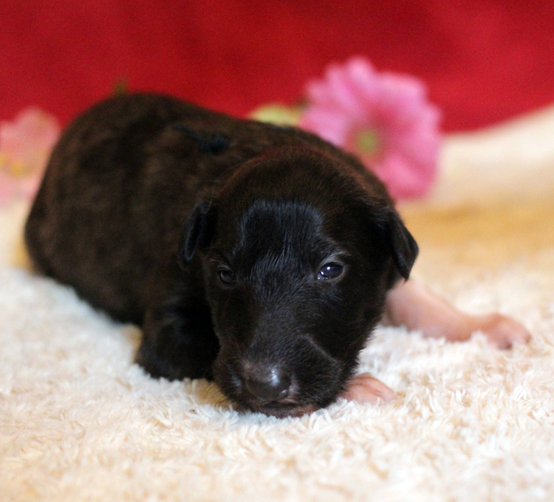 Farbverlauf bei der Farbe: Schwarz-gestromt.Es geht um die Farben der Welpen mit blauem, rosa und schwarzem Halsband. Wir zeigen hier auf, wie die Farbe sich später zeigt am Beispiel von "Ella", eine Tochter von Nitro aus ihrem 1. Wurf. 22.10.2025: 5 Tage alt Hündin in Blau, Hündin in Rosa, der Schöne mit dem schwarzen Halsband Hier der Farbverlauf von "Ella": ![]() Ella und Schwesterchen Nathalie, 1 Woche alt, man erkennt schon die Stromung. ( Die ebenfalls dunkel anmutende Nathalie zeigen wir später auch noch einmal, so, wie sie jetzt aussieht. ) ![]() Ella im Alter von 2 Wochen. ![]() Das ist Ella im Alter von 5 Wochen, immer noch sehr dunkel.
