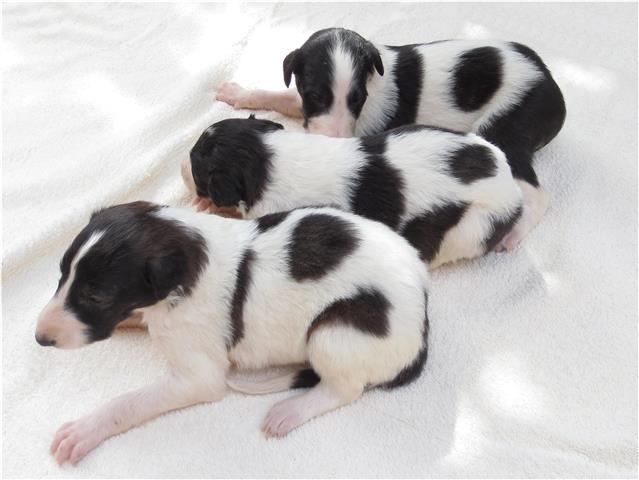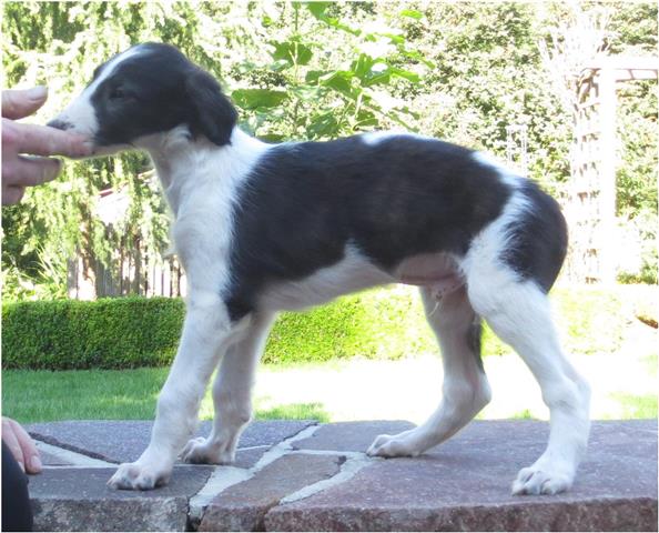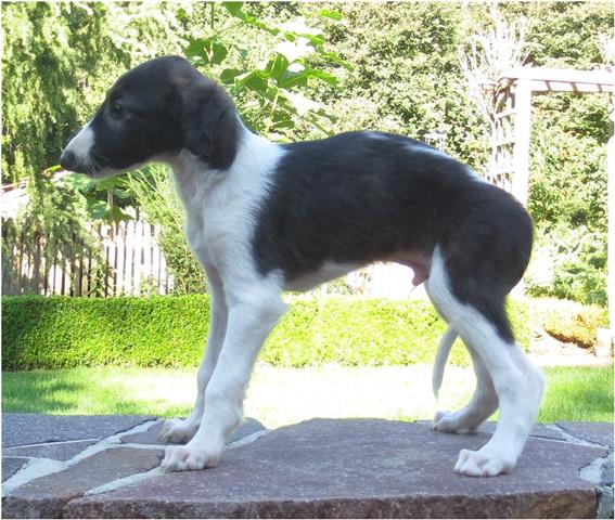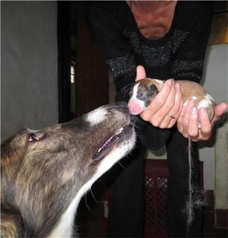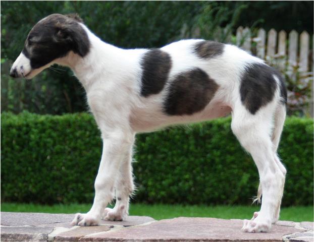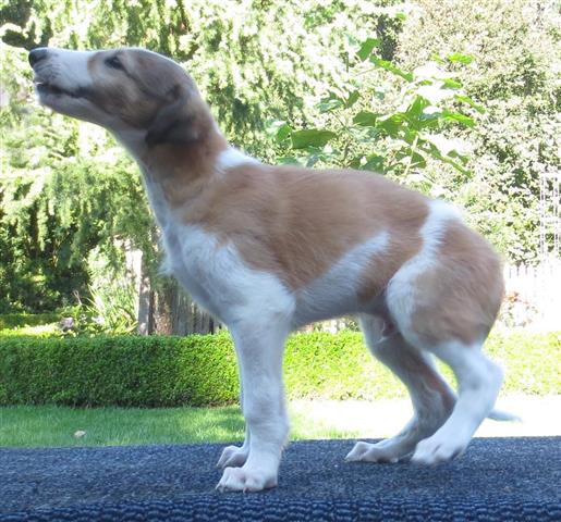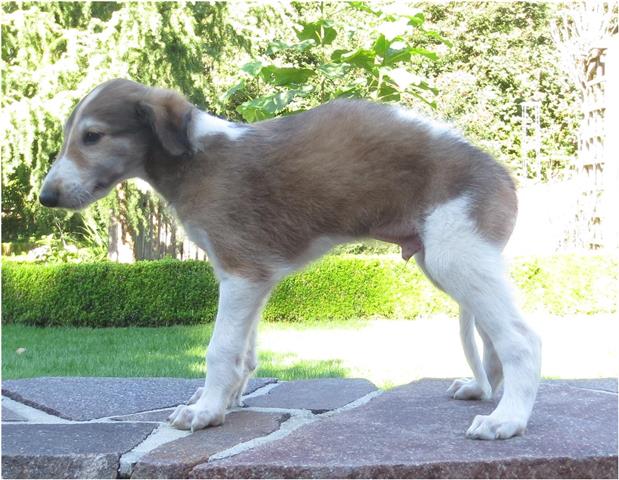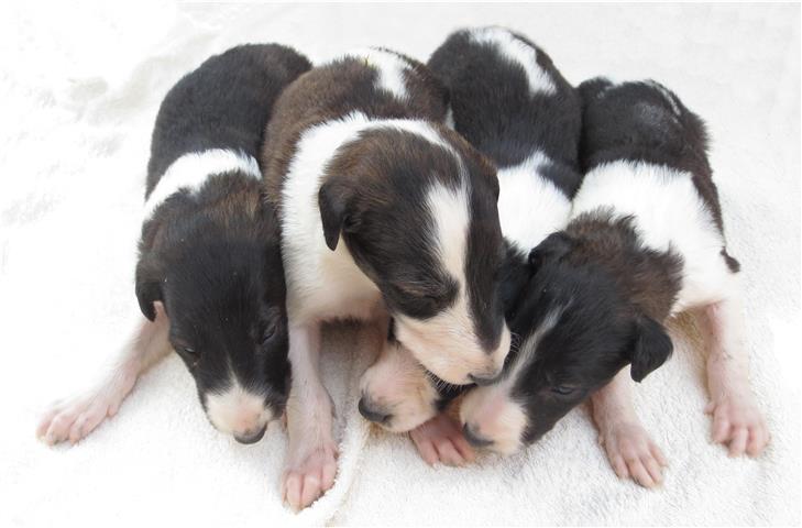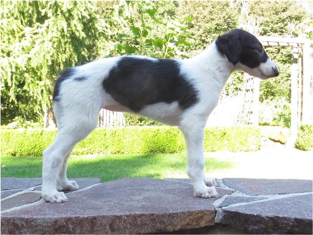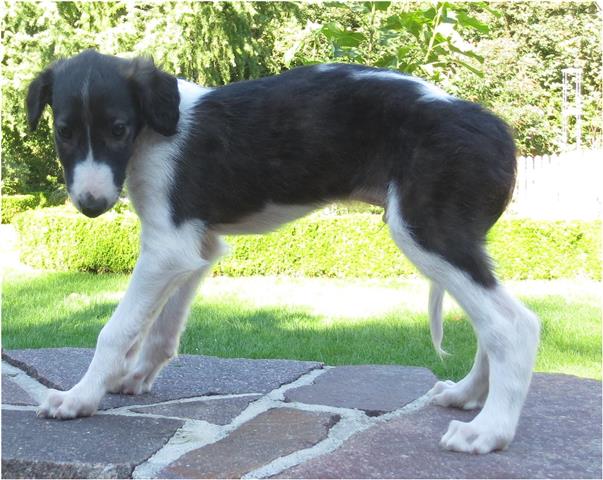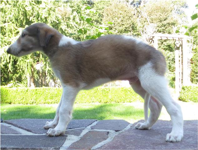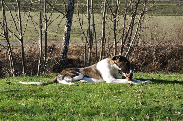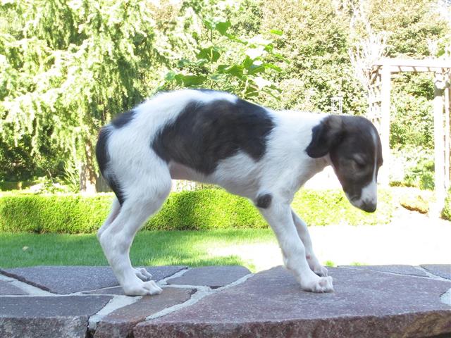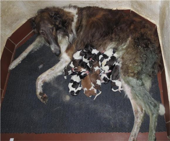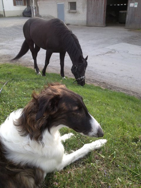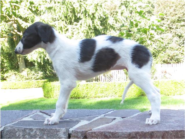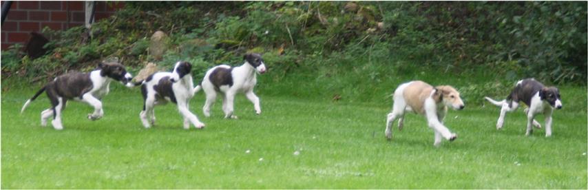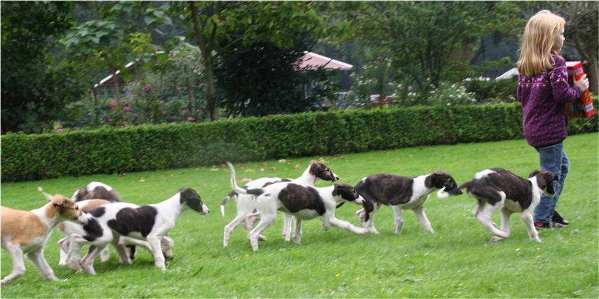 Am 20.07.2013 wurden 9 süße Welpen geboren: 6 kleine Rüden und 3 Mädchen. Das hier sind die beiden ersten! 25.07.2013: Die Pigmentierung setzt ein. Orlik und Odaloiy, Otvaya und Opal. 08.08.2013: Die 3 Mädchen sehen sich fast zum Verwechseln ähnlich! Die dunklen 4 Rüden: Odaloij, Ochotnik, Opal und Otvaya. Die beiden Roten: Oleg und Orlik. 14.08.2013: Odaloij auf Achims Arm, er sollte zu uns kommen. 06.09.2013: Olessia Olala Olya Die Dritte im Bunde: Oblonka Jetzt die kleinen Rüden: Opal Odaloij Otvaya Ochotnik Orlik Oleg 25.09.2013: Spielen im Garten mit Hubi und Merete. Sie lernen alles kennen, auch Katzen. Onkel Maxim und Onkel Nabat begrüßen ihre Nichten und Neffen. Auf einem Pferdezuchthof gibt es immer viel zu tun, und nicht alles kann man auf einmal schaffen. Da jetzt wieder öfter Welpen hier zur Welt kommen sollen, wird das Hundegehege komplett aufgearbeitet: Es wird umgepflügt, Bäumchen werden gepflanzt und neuer Rasen wird eingesät. Natürlich muß sich das alles erst richtig wieder festigen und anwachsen, so haben die Barsois erst einmal ein kleineres, provisorisches Gehege. Doch alles liegt bereit, die große Auslauffläche wieder frei zu geben. 27.09.2013: Fotoshooting: Oblonka, Olessia, Metete und ich mit Olala Oleg und Orlik Odaloij und Opal Have a brake, have a kitkat: Schmusen mit der Katze! Sie lernen fast alle Tiere kennen, die auf einem Bauernhof leben. Das Leben in der neuen Familie: Otvaya: Otvaya hat ein wunderschönes Zuhause in Liechtenstein gefunden. Hin und wieder treffe ich ihn auf Ausstellungen. Auch von ihm bekomme ich regelmäßig Fotos und erfahre, wie es ihm geht. Erste Bilder von Otvaya zu Hause in Liechtenstein.