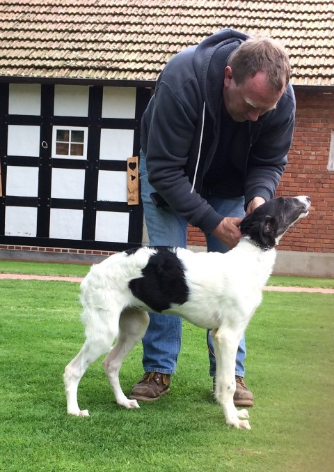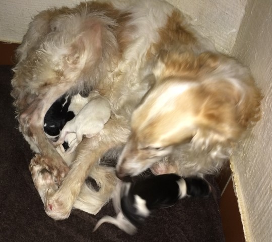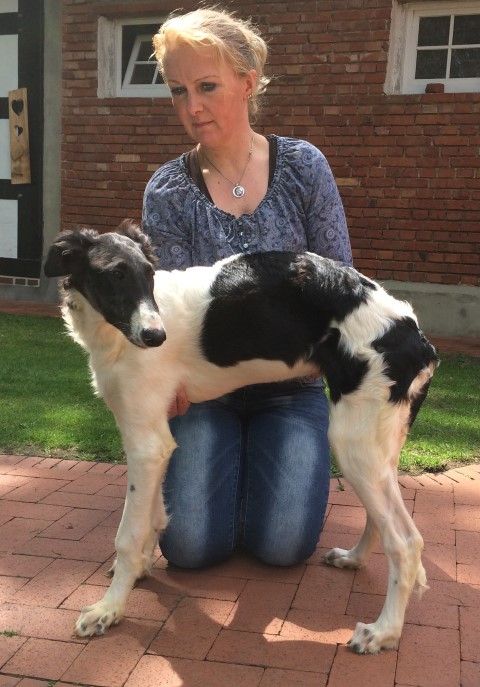 Am 08.01.2015 erblickten 5 süße Welpen das Licht der Welt: 1 schwarzgemantelter Rüde und 4 Mädchen: Eine mit schwarzen Platten, eine ( wahrscheinlich ) rot mit schwarzer Maske und eine so wie Niemen, ihrem Vater! ![]() ![]() Der kleine Rüde ist oben links im Bild zu sehen! Mama Bohdana kümmert sich rührend um ihre Kleinen, die alle auf dem Wohnzimmersofa der Familie Bührmann zur Welt kamen. Gott sei Dank war das aus Leder, die Decken kann man ja waschen! Inzwischen sind sie alle in ihr Welpenhaus umgezogen und räkeln sie auf dem warmen Fliesen, die individuell mit Bodenheizung unterlegt sind, so dass Mutter und auch die Welpen sich ihre speziellen Wohlfühlzonen aussuchen können. ( Für mich ist das selbstverständlich, jedoch für die Besucher der website natürlich nicht, so dass ich es erwähnen muß, denn sonst entsteht noch ein falscher Eindruck! ) Inzwischen hat Ludger ihnen auch Namen gegeben: Der Rüde heißt Paul, die Mantelhündin heißt Paula, die weiß-cremefarbene wird Petty gerufen und die beiden mit Platten heißen Peggy und Petra. Ich, als "Großmutter" väterlicherseits denke: Na, dass sind noch einmal Namen! Die hat so leicht keiner und sie sind so gut passend für russische Windhunde! 03.03.2015: 2 der süßen Welpen habe ich heute fotografiert: Paulchen und Panja: