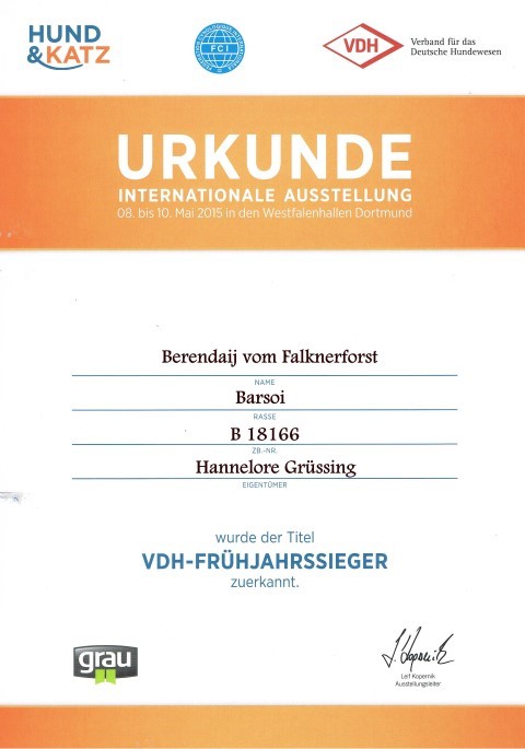 Richterin: Frau Ahrend, D Amethyst: in der Jüngstenklasse: VVSP1, Jüngsten-BOB, Opal: Zwischenklasse: V1, VDH, Res-CAC, Res-CACIB, Berendaij: offene Klasse: V1, VDH, CAC, BR, CACIB, BOS, Frühjahrssieger Dortmund 2015