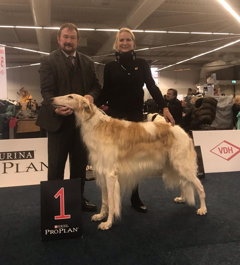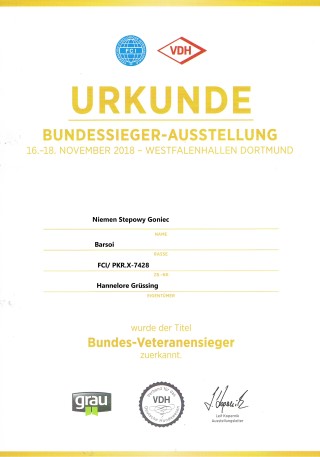 Dortmund, 16.11.2018 Internationale Ausstellung Richter: Herr Sean Delmar/IRL Niemen in der Veteranenklasse: Platz 1, Vet.-VDH, Vet.-CAC, Bester Veteran, Herbst-Veteranen-Sieger Dortmund 2018 ![]() ![]() Dortmund, 18.11.2018: Bundessiegerausstellung Richterin: Frau Cathy Delmar/IRL Niemen in der Veteranenklasse: Platz 1, Vet.-VDH, Vet.-CAC, Bester Veteran, VDH-Bundes-Veteranensieger Dortmund 2018