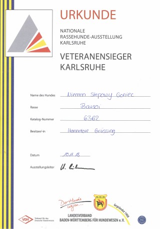 Richterin: Frau R. Tromp-Prujin/NL Brilliant in der Zwischenklasse: SG2 Niemen in der Veteranenklasse: Platz 1, Vet.-VDH, Vet.-CAC, bester Veteran, Veteranensieger Karlsruhe