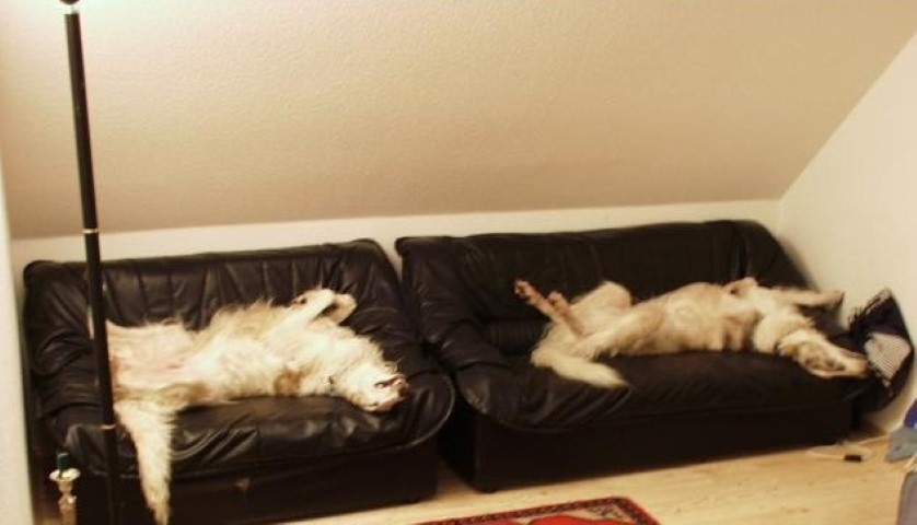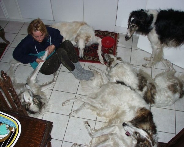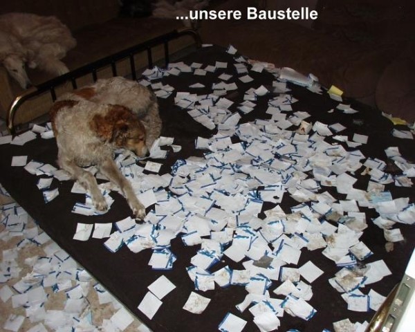Das Leben im Übergangshaus in Großenkneten: 2001-2003. Da mein Mann lieber im "Norden" lebte, zogen wir nach unserer Heirat übergangsweise in ein Haus in Großenkneten. Die Pferde wohnten in einer Privatreitanlage, die Barsois im Haus bei uns. Von dort aus suchten wir nach einem Resthof und wurden in Dinklage fündig...... ![]() ![]() Das eigene Hundezimmer....., ![]() und trotzdem "schleicht hund sich nur zu gerne ins Menschenschlafzimmer...... ![]() ![]() ![]() In der Küche läßt es sich erfahrungsgemäß gut leben...... ![]() ![]() sowohl unter, als auch am Tisch! ![]() ![]() Und einen großen garten hatten sie natürlich auch...... ! ![]() |