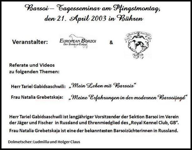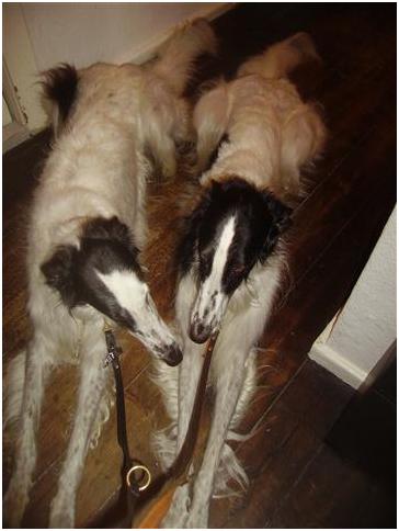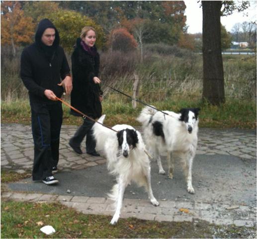 12.04.2012: heute starb Feopen, der Vater von Maxim, Nabat & Neweßta, Berendaij & Bohdana. Er war ein toller Rüde und seine Kinder werden sein Erbe in Ehren halten ! Today Feopen died, the father of Maxim, Nabat & Neweßta, Berendaij & Bohdana. He was a great male and his children will cherish his heritage! ![]() ![]() 06.04.2012: Berendaij, Niemen und Nabat waren in Hoope. Maxim konnte leider nicht mit, er hatte sich am Fuß verletzt. Die Schweizer Richterin Frau Marlis Müller, gab in der Jugendklasse nur SGs, Berendaij wurde zweiter mit SG2. Niemen bekam in der Zwischenklasse V1und VDH-CH-A und Nabat in der offenen Klasse V2 und Res-VDH-CH-A. Nachdem wir fertig waren, schlug das bislang schöne Wetter um und es begann zu regnen. So war es für uns alle ein sehr sehr schöner, erfolgreicher Tag. ( Bilder unter: Zuchtschauen ) Berendaij, Niemen and Nabat have been in Hoope. Maxim could not come with us, cause he hurt himself on his foot. Der Swiss judg Ms Marlis Müller assigned only SG in the Junior Class, Berendaij became second with SG2. Niemen got in the Intermediate Class V1 and VDH-CH-A und Nabat in the Open Class V2 and Res-VDH-CH-A. After all fine weather veered and the rain started. So it was for all of us a very very beautiful, successful day. 31.03.2012: Heute beginnt für unsere Barsois das "Neue Arbeitsjahr": Berendaij und Maxim waren auf der CAC-Ausstellung in Hildesheim. Die Barsois wurden von Herrn Richter gerichtet. Berendaij erlangte ein V2, Res.Jgd-VDH und ResJgd-CAC. Für Maxim war es seine erste Ausstellung und er gewann mit V1, VDH-CH-A und CAC im Stechen auch den Titel "Bester Rüde"! Wir sind sehr glücklich über seinen Erfolg !( Bilder unter: Zuchtschauen ) Today for our borzois startet the new "Working-year": Berendaij and Maxim have been on the CAC-show in Hildesheim. The borzois were judget by Mr. Richter. Berendaij got a Exelent 2, Res.Jgd-VDH and ResJgd-CAC. For Maxim it was his first show and he was winning with Exelent 1, VDH-CH-A and CAC the toss and got also the title " Best male dog" We are very proud about his success !